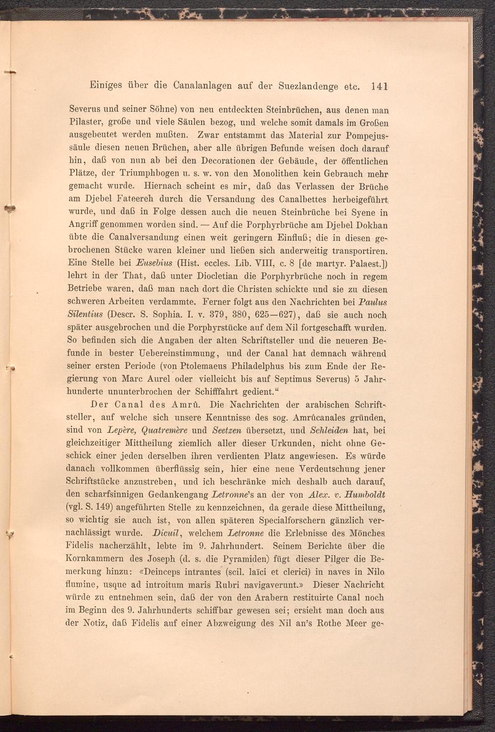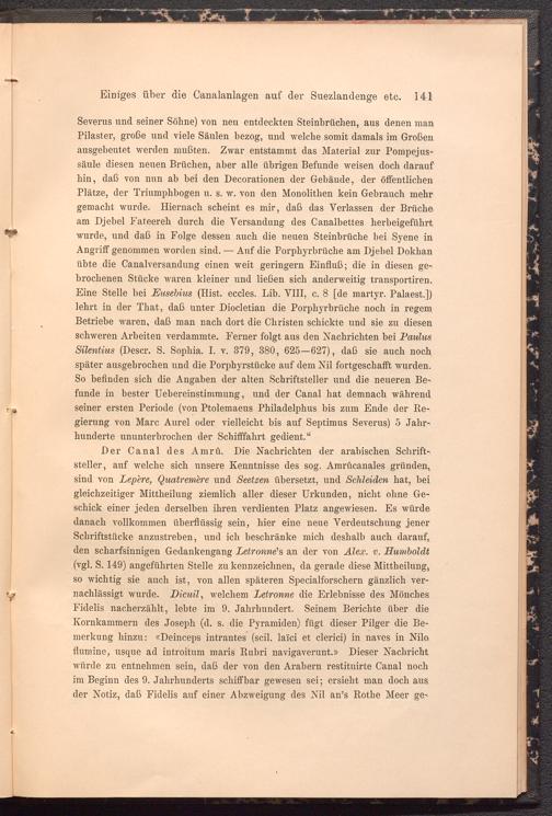 Der Canal des Amrü. Die Nachrichten der arabischen Schriftsteller, auf welche sich unsere Kenntnisse des sog. Amrücanales gründen, sind von Lepere, Quatremere und Seetzen übersetzt, und Schleiden hat, hei gleichzeitiger Mittheilung ziemlich aller dieser Urkunden, nicht ohne Geschick einer jeden derselben ihren verdienten Platz angewiesen. Es würde danach vollkommen überflüssig sein, hier eine neue Verdeutschung jener Schriftstücke anzustreben, und ich beschränke mich deshalb auch darauf, den scharfsinnigen Gedankengang Letronne 1 s an der von Alex. v. Humboldt (vgl. S. 149) angeführten Stelle zu kennzeichnen, da gerade diese Mittheilung, so wichtig sie auch ist, von allen späteren Specialforschern gänzlich vernachlässigt wurde. Dicuil , welchem Letronne die Erlebnisse des Mönches Fidelis nacherzählt, lebte im 9. Jahrhundert. Seinem Berichte über die Kornkammern des Joseph (d. s. die Pyramiden) fügt dieser Pilger die Bemerkung hinzu: «Deinceps intrantes (seil, laici et clerici) in naves in Nilo flumine, usque ad introitum maris Rubri navigaverunt.» Dieser Nachricht würde zu entnehmen sein, daß der von den Arabern restituirte Canal noch im Beginn des 9. Jahrhunderts schiffbar gewesen sei; ersieht man doch aus der Notiz, daß Fidelis auf einer Abzweigung des Nil am’s Rothe Meer ge-