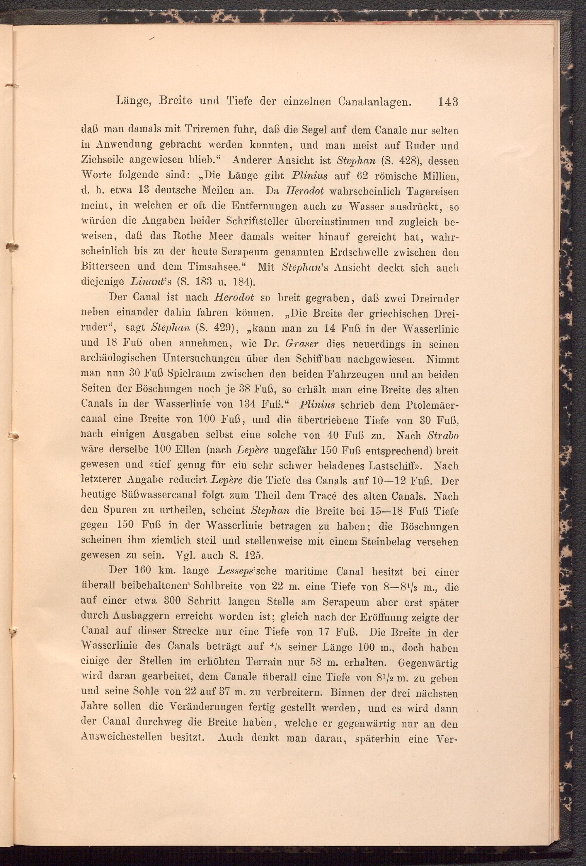 daß man damals mit Triremen fuhr, daß die Segel auf dem Canale nur selten in Anwendung gebracht werden konnten, und man meist auf Ruder und Ziehseile angewiesen blieb.“ Anderer Ansicht ist Stephan (S. 428), dessen Worte folgende sind: „Die Länge gibt Plinius auf 62 römische Millien, d. li. etwa 13 deutsche Meilen an. Da Herodot wahrscheinlich Tagereisen meint, in welchen er oft die Entfernungen auch zu Wasser ausdrückt, so würden die Angaben beider Schriftsteller übereinstimmen und zugleich beweisen, daß das Rothe Meer damals weiter hinauf gereicht hat, wahrscheinlich bis zu der heute Serapeum genannten Erdschwelle zwischen den Ritterseen und dem Timsahsee.“ Mit Stephan’’ s Ansicht deckt sich auch diejenige Linant’’ s (S. 183 u. 184).