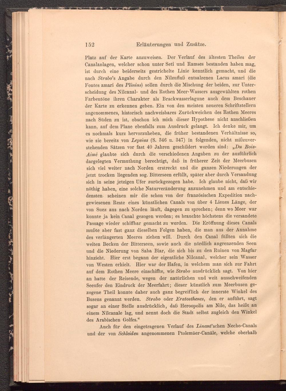 Platz auf der Karte anzuweisen. Der Verlauf des ältesten Theiles der Canalanlagen, welcher schon unter Seti und Ranises bestanden haben mag, ist durch eine beiderseits gestrichelte Linie kenntlich gemacht, und die nach Strobe? s Angabe durch den Nilzufluß entsalzenen Lacus amari (die Fontes amari des Plinius ) sollen durch die Mischung der beiden, zur Unterscheidung des Nilcanal- und des Rothen Meer-Wassers ausgewählten rothen Farbentöne ihren Charakter als Brackwasserlagune auch dem Beschauer der Karte zu erkennen geben. Ein von den meisten neueren Schriftstellern angenommenes, historisch nachweisbares Zurückweichen des Rothen Meeres nach Süden zu ist, obschon ich mich dieser Hypothese nicht anschließen kann, auf dem Plane ebenfalls zum Ausdruck gelangt. Ich denke mir, um es nochmals kurz hervorzuheben, die früher bestandenen Verhältnisse so, wie sie bereits von Lepsius (S. 846 u. 347) in folgenden, nicht mißzuver- stehenden Sätzen vor fast 40 Jahren geschildert worden sind: „Du Bois- Aimé glaubte sich durch die verschiedenen Angaben zu der ausführlich dargelegten Vermuthung berechtigt, daß in früherer Zeit der Meerbusen sich viel weiter nach Norden erstreckt und die ganzen Niederungen der jetzt trocken liegenden sog. Bitterseen erfüllt, später aber durch Versandung sich in seine jetzigen Ufer zurückgezogen habe. Ich glaube nicht, daß wir nöthig haben, eine solche Natur Veränderung anzunehmen und am entschiedensten scheinen mir die schon von der französischen Expedition nachgewiesenen Reste eines künstlichen Canals von über 4 Lieues Länge, der von Suez aus nach Norden läuft, dagegen zu sprechen; denn wo Meer war konnte ja kein Canal gezogen werden; es brauchte höchstens die versandete Passage wieder schiffbar gemacht zu werden. Die Eröffnung dieses Canals mußte aber fast ganz dieselben Folgen haben, die man aus der Annahme des verlängerten Meeres ziehen will. Durch den Canal füllten sich die weiten Becken der Bitterseen, sowie auch die nördlich angrenzenden Seen und die Niederung von Saba Biar, die sich bis zu den Ruinen von Magfar hinzieht. Hier erst begann der eigentliche Nilcanal, welcher sein Wasser von Westen erhielt. Hier war der Hafen, in welchem man sich zur Fahrt auf dem Rothen Meere einschiffte, wie Strabo ausdrücklich sagt. Von hier an hatte der Reisende, wegen der natürlichen und weit ausschweifenden Seeufer den Eindruck der Meerfahrt; dieser künstlich zum Meerbusen gezogene Theil konnte daher auch ganz begreiflich der innerste Winkel des Busens genannt werden. Strabo oder Eratosthenes , den er anführt, sagt sogar an einer Stelle ausdrücklich, daß Heroopolis am Nile, das heißt an einem Nilcanale lag, und nennt doch die Stadt selbst zugleich den Winkel des Arabischen Golfes.“