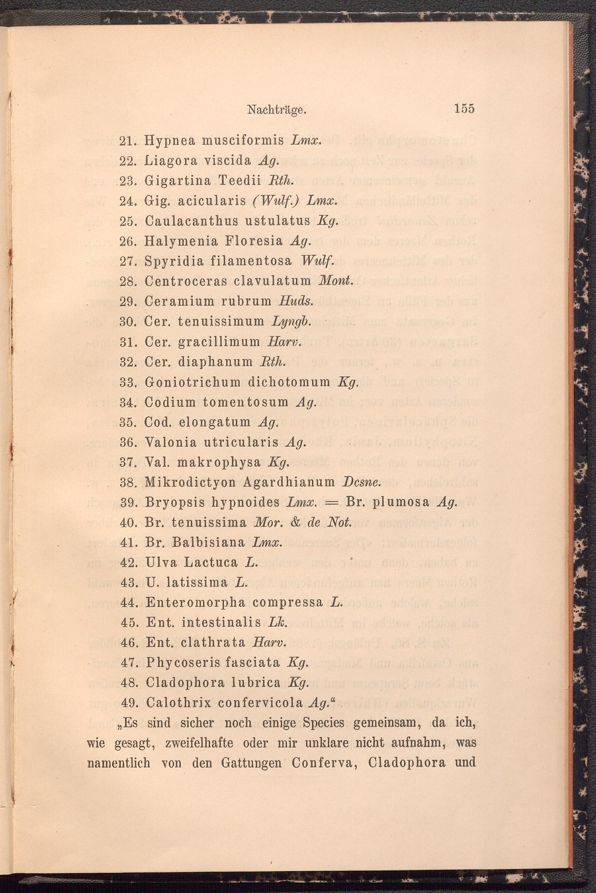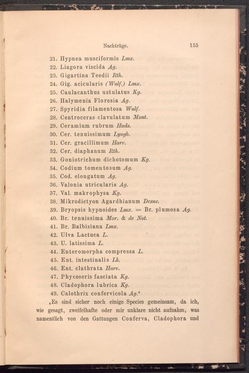 „Es sind sicher noch einige Species gemeinsam, da ich, wie gesagt, zweifelhafte oder mir unklare nicht aufnahm, was namentlich von den Gattungen Conferva, Cladophora und