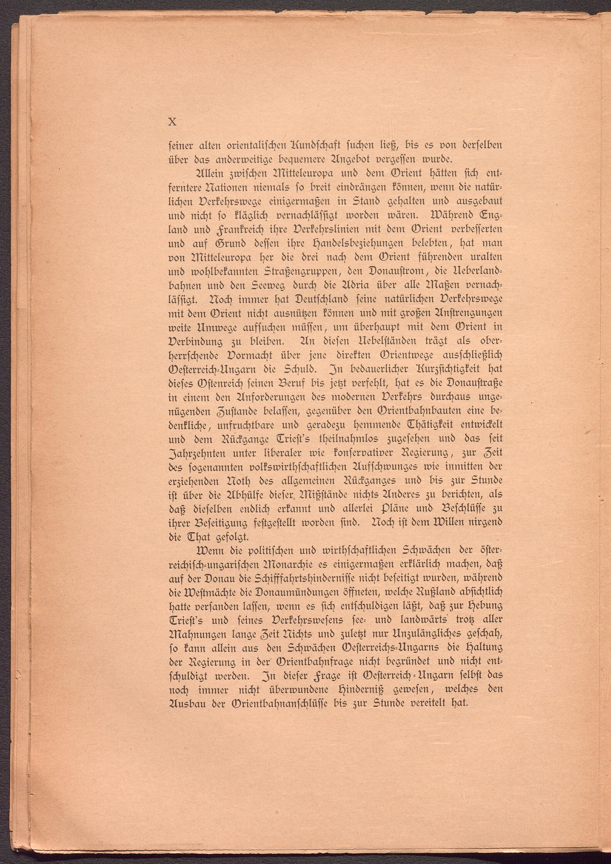Wenn die politischen und wirtschaftlichen Schwächen der österreichisch-ungarischen Monarchie es einigermaßen erklärlich machen, daß aus der Donau die Schiffsahrtshindernisse nicht beseitigt wurden, während die Westmächte die Donaumündungen öffneten, welche Rußland absichtlich hatte versanden lassen, wenn es sich entschuldigen läßt, daß zur Hebung Triest's und seines Verkehrswesens see- und landwärts trotz aller Mahnungen lange Zeit Nichts und zuletzt nur Unzulängliches geschah, so kann allein aus den Schwächen Oesterreichs-Ungarns die Haltung der Regierung in der Grientbahnfrage nicht begründet und nicht entschuldigt werden. In dieser Frage ist Oesterreich - Ungarn selbst das noch immer nicht überwundene Hinderniß gewesen, welches den Ausbau der Grientbahnanschlüsse bis zur Stunde vereitelt hat.