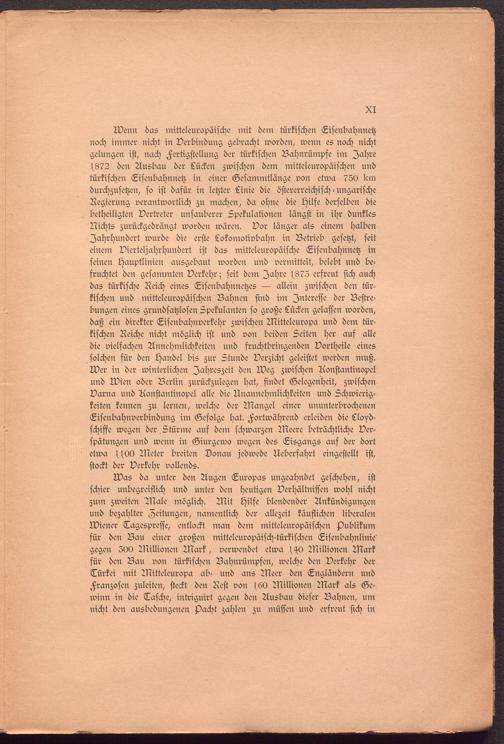Was da unter den Augen Europas ungeahndet geschehen, ist schier unbegreiflich und unter den heutigen Verhältnissen wohl nicht zum zweiten Male möglich. Mit Hilfe blendender Ankündigungen und bezahlter Zeitungen, namentlich der allezeit käuflichen liberalen Wiener Tagespresse, entlockt man dem mitteleuropäischen Publikum für den Bau einer großen mitteleuropäisch-türkischen Eisenbahnlinie' gegen 300 Millionen Mark, verwendet etwa s^O Millionen Mark für den Bau von türkischen Bahnrümpsen, welche den Verkehr der Türkei mit Mitteleuropa ab- und ans Meer den Engländern und Franzosen zuleiten, steckt den Rest von s60 Millionen Mark als Gewinn in die Tasche, intriguirt gegen den Ausbau dieser Bahnen, um nicht den ausbedungenen H>acht zahlen zu müssen und erfreut sich in