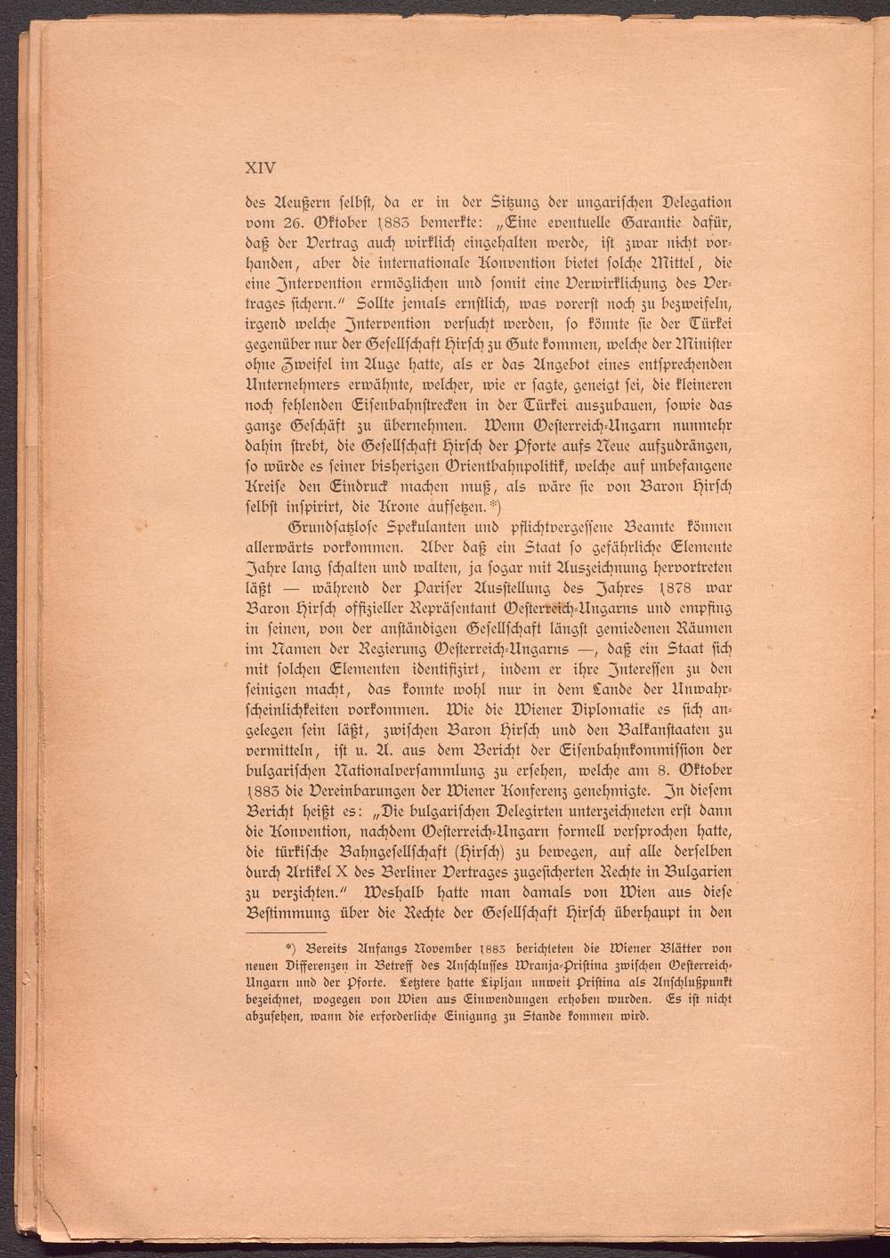 des Aeußern selbst, da er in der Ätzung der ungarischen Delegation vom 26. Oktober 1883 bemerkte: „Eine eventuelle Garantie dafür, daß der Vertrag auch wirklich eingehalten werde, ist zwar nicht vorhanden, aber die internationale Konvention bietet solche Mittel, die eine Intervention ermöglichen und somit eine Verwirklichung des Vertrages sichern." sollte jemals ernstlich, was vorerst noch zu bezweifeln, irgend welche Intervention versucht werden, so könnte sie der Türkei gegenüber nur der Gesellschaft Hirsch zu Gute kommen, welche der Minister ohne Zweifel im Auge hatte, als er das Angebot eines entsprechenden Unternehmers erwähnte, welcher, wie er sagte, geneigt sei, die kleineren noch fehlenden Eisenbahnstrecken in der Türkei auszubauen, sowie das ganze Geschäft zu übernehmen. U)enn Gesterreich-Ungarn nunmehr dahin strebt, die Gesellschaft Hirsch der Hfforte aufs Neue aufzudrängen, so würde es seiner bisherigen Orientbahnpolitik, welche auf unbefangene Kreise den Eindruck machen muß, als wäre sie von Baron Hirsch selbst inspirirt, die Krone aufsetzen.*)