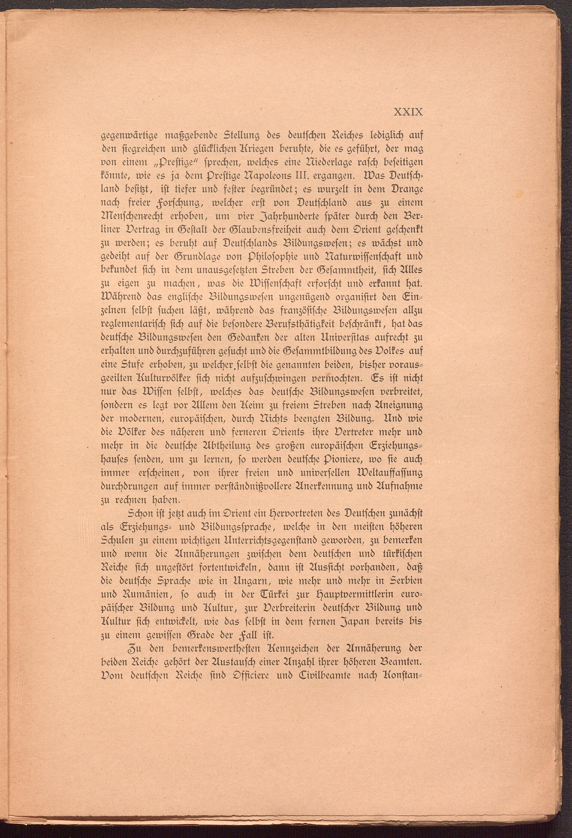 Schon ist jetzt auch im Orient ein Hervortreten des Deutschen zunächst als Erziehungs- und Bildungssprache, welche in den meisten höheren Schulen zu einem wichtigen Unterrichtsgegenstand geworden, zu bemerken und wenn die Annäherungen zwischen dem deutschen und türkischen Reiche sich ungestört fortentwickeln, dann ist Aussicht vorhanden, daß die deutsche Sprache wie in Ungarn, wie mehr und mehr in Serbien und Rumänien, so auch in der Türkei zur Hauptvermittlerin europäischer Bildung und Aultur, zur Verbreiterin deutscher Bildung und Aultur sich entwickelt, wie das selbst in dem fernen Japan bereits bis zu einem gewissen Grade der Fall ist.