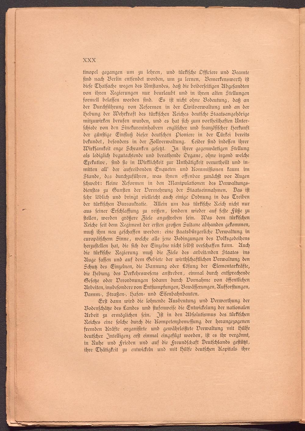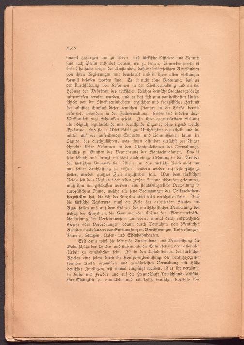 Erst dann wird die lohnende Ausbeutung und Verwerthung der Bodenschätze des Landes und stufenweise die Entwickelung der nationalen Arbeit zu ermöglichen sein. Ist in den Absolutismus des türkischen Reiches eine solche durch die Kompetenzbemeffung der herangezogenen fremden Kräfte organisirte und gewährleistete Verwaltung mit Hülfe deutscher Intelligenz erst einmal eingefügt worden, ist es ihr vergönnt, in Ruhe und Frieden und auf die Freundschaft Deutschlands gestützt, ihre Thätigkeit zu entwickeln und mit Hülfe deutschen Kapitals ihre