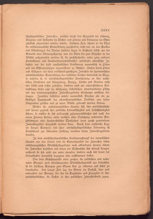 Wollen die mitteleuropäischen Staaten sich ihre wirthschastliche und hiemit zugleich ihre politische Lebensfähigkeit und Selbständigkeit sichern, so müssen sie sich zielbewußt zusammenschließen und nach den neuen Formen streben, unter welchen ohne Verletzung nationaler Empfindungen oder staatsrechtlicher Thatsachen jenes große gemeinsame Interessengebiet hergestellt werden kann. Durch seine natürliche Lage im Herzen Europa's mit ihrer wirthschaftspolitischen Bedeutung ist Deutschland zur führenden Stellung inmitten dieses Interessengebietes berufen.