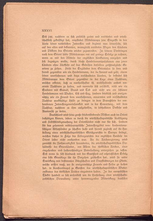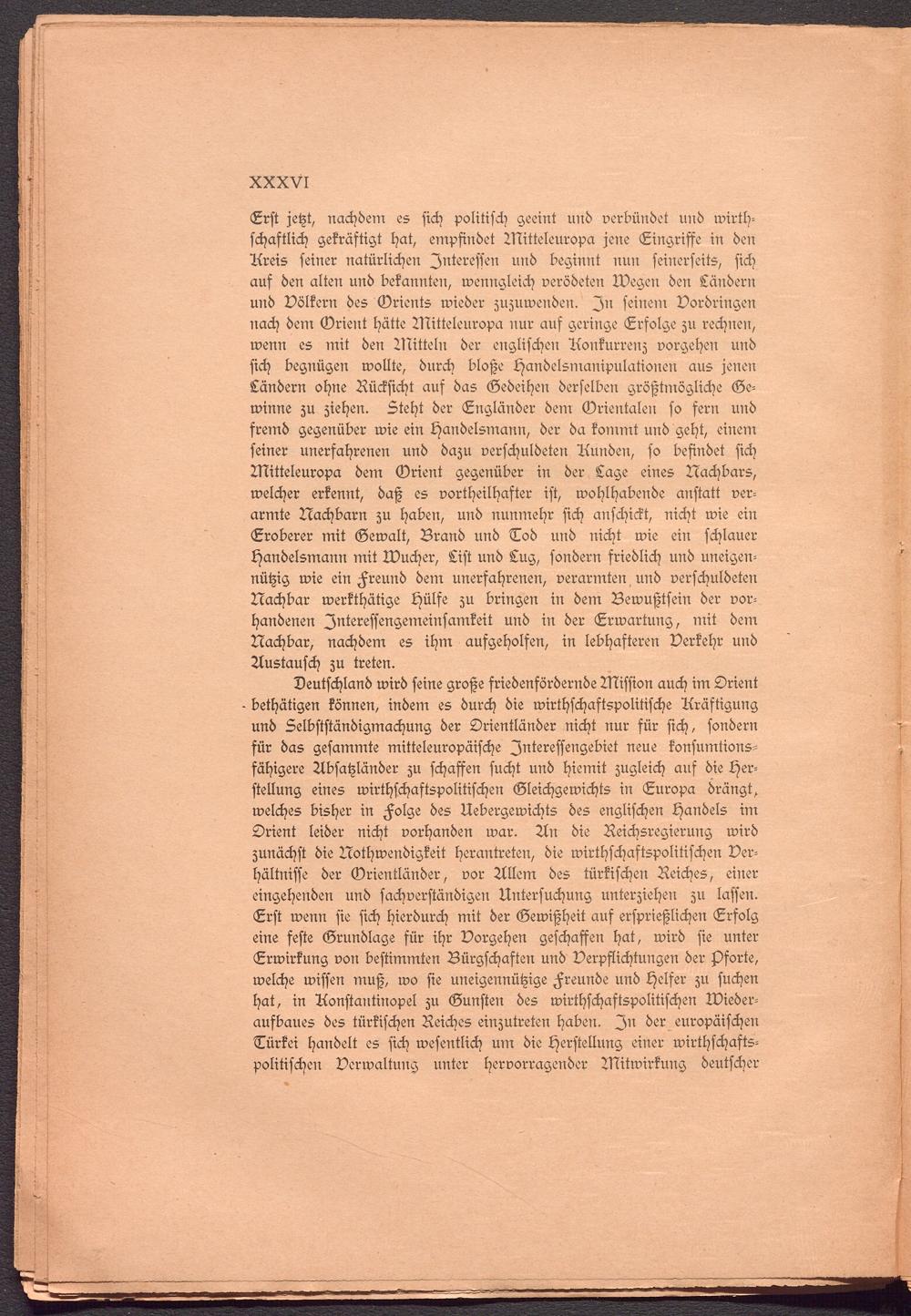 Deutschland wird seine große sriedensördernde Mission auch im Orient bethätigen können, indem es durch die wirthschaftspolitische Aräftigung und Selbstständigmachung der Orientländer nicht nur für sich, sondern für das gesammte mitteleuropäische Interessengebiet neue konsumtions- sähigere Absatzländer zu schaffen sucht und hiemit zugleich auf die Herstellung eines wirthschaftspolitische:: Gleichgewichts in Europa drängt, welches bisher in Folge des Uebergewichts des englischen Handels im Orient leider nicht vorhanden war. An die Reichsregierung wird zunächst die Nothwendigkeit herantreten, die wirthschaftspolitischen Verhältnisse der Grientländer, vor Allem des türkischen Reiches, einer eingehenden und sachverständigen Untersuchung unterziehen zu lassen. Erst wenn sie sich hierdurch mit der Gewißheit auf ersprießlichen Erfolg eine feste Grundlage für ihr Vorgehen geschaffen hat, wird sie unter Erwirkung von bestimmten Bürgschaften und Verpflichtungen der Hfforte, welche wissen muß, wo sie uneigennützige Freunde und Helfer zu suchen hat, in Aonstantinopel zu Gunsten des wirthschaftspolitischen Wiederaufbaues des türkischen Reiches einzutreten haben. In der europäischen Türkei handelt es sich wesentlich um die Herstellung einer wirthschaftspolitischen Verwaltung unter hervorragender Mitwirkung deutscher