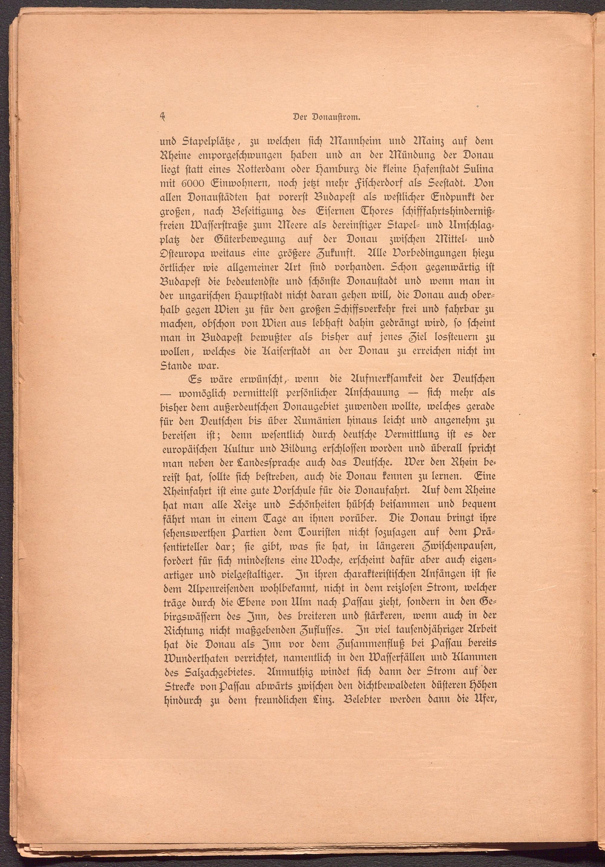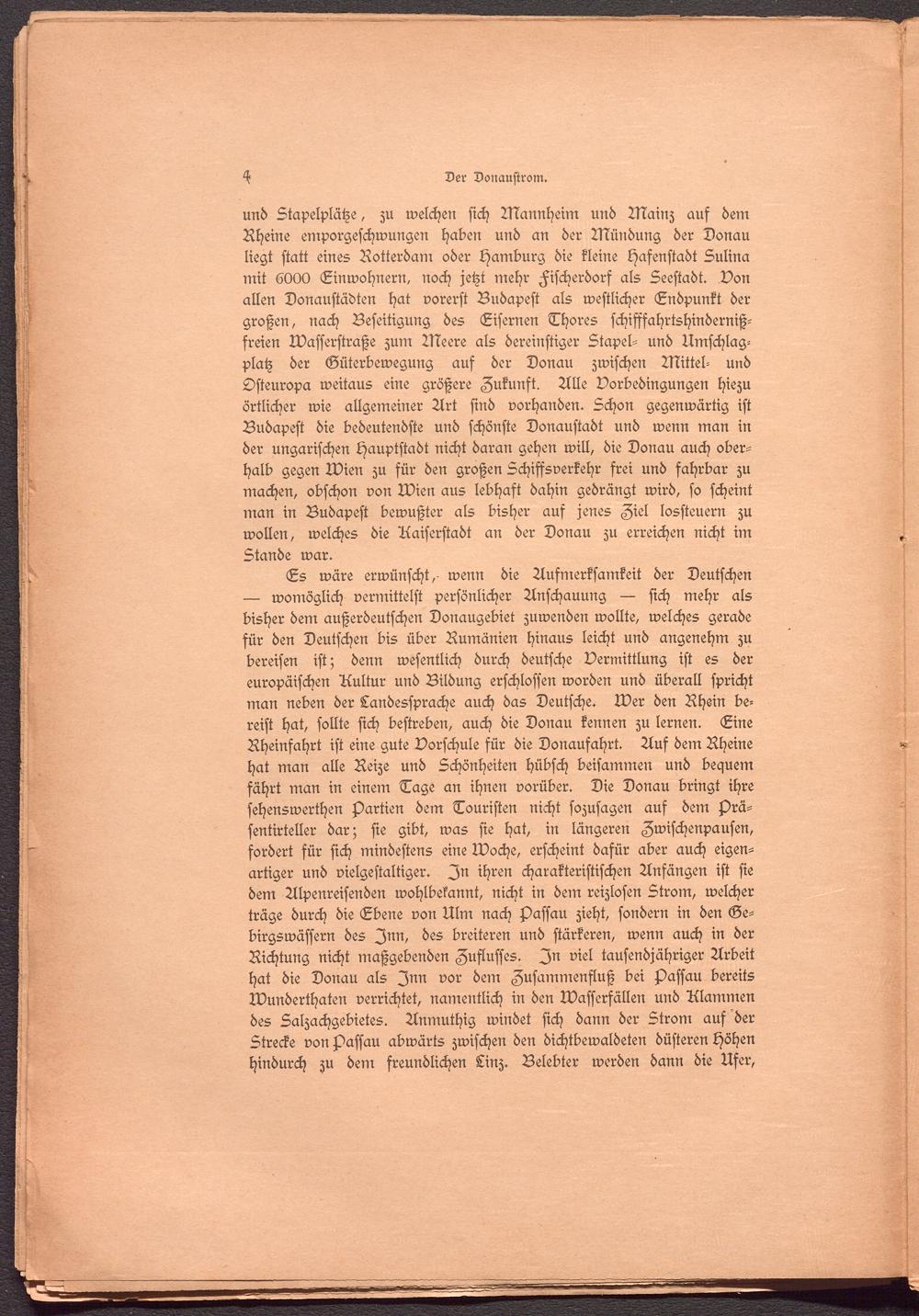Es wäre erwünscht, wenn die Aufmerksamkeit der Deutschen — womöglich vermittelst persönlicher Anschauung — sich mehr als bisher dem außerdeutschen Donaugebiet zuwenden wollte, welches gerade für den Deutschen bis über Rumänien hinaus leicht und angenehm zu bereisen ist; denn wesentlich durch deutsche Vermittlung ist es der europäischen Aultur und Bildung erschlossen worden und überall spricht man neben der Landessprache auch das Deutsche. Wer den Rhein bereist hat, sollte sich bestreben, auch die Donau kennen zu lernen. Eine Rheinfahrt ist eine gute Vorschule für die Donaufahrt. Auf dem Rheins hat man alle Reize und Schönheiten hübsch beisammen und bequem fährt man in einem Tage an ihnen vorüber. Die Donau bringt ihre sehenswerthen Partien dem Touristen nicht sozusagen auf dem prä- sentirteller dar; sie gibt, was sie hat, in längeren Zwischenpausen, fordert für sich mindestens eine Woche, erscheint dafür aber auch eigenartiger und vielgestaltiger. In ihren charakteristischen Anfängen ist sie dem Alpenreisenden wohlbekannt, nicht in dem reizlosen Strom, welcher träge durch die Ebene von Ulm nach Passau zieht, sondern in den Ge- birgswässern des Inn, des breiteren und stärkeren, wenn auch in der Richtung nicht maßgebenden Zuflusses. In viel tausendjähriger Arbeit hat die Donau als Inn vor dem Zusammenfluß bei Passau bereits Wunderthaten verrichtet, namentlich in den Wasserfällen und Alammen des Salzachgebietes. Anmuthig windet sich dann der Strom auf der Strecke von pasfau abwärts zwischen den dichtbewaldeten düsteren Höhen hindurch zu dem freundlichen Linz. Belebter werden dann die Ufer,