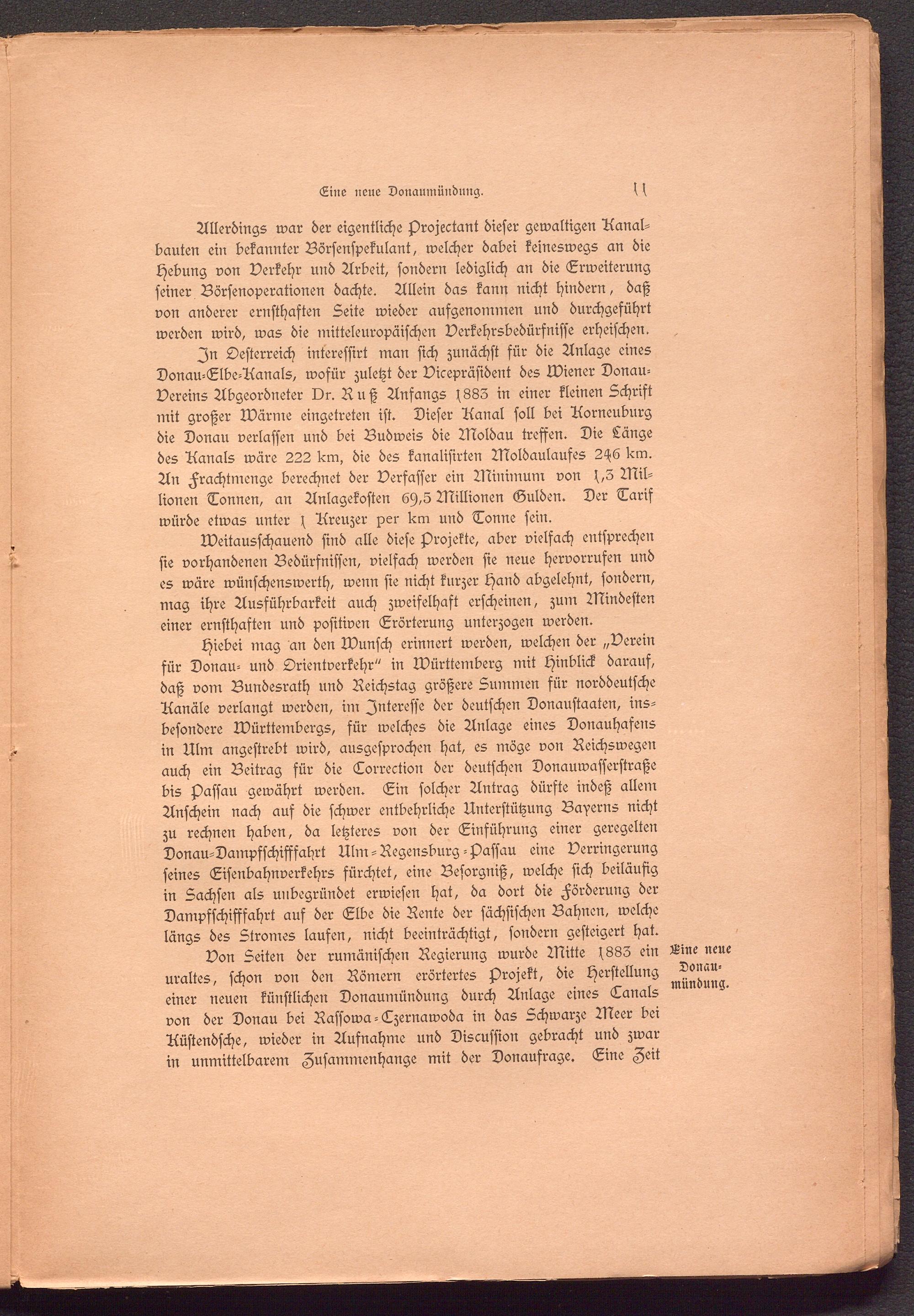 Von Seiten der rumänischen Regierung wurde Mitte s883 ein uraltes, schon von den Römern erörtertes Projekt, die Herstellung einer neuen künstlichen Donaumündung durch Anlage eines Eanals von der Donau bei Rassowa - Ezernawoda in das Schwarze Meer bei Aüstendsche, wieder in Aufnahme und Discussion gebracht und zwar in unmittelbarem Zusammenhange mit der Donaufrage. Eine Zeit