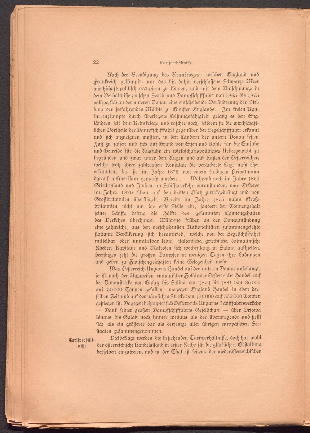 Was Oesterreich-Ungarns Handel aus der unteren Donau anbelangt, so ist nach den Ausweisen rumänischer Zollämter Oesterreichs Händel auf der Donaustrecke von Galatz bis Sulina von s879 bis s88s von 86000 aus 50000 Tonnen gefallen, wogegen England Handel in eben derselben Zeit und auf der nämlichen Strecke von s36000 auf 332000 Tonnen gestiegen ist. Dagegen behauptet sich Oesterreich-Ungarns Schifffahrtsverkehr — Dank seiner großen Dampfschifffahrts-Gesellschaft -- über Orsowa hinaus bis Galatz noch immer weitaus als der überwiegende und stellt sich als ein größerer dar als derjenige aller übrigen europäischen Seestaaten zusammengenommen.