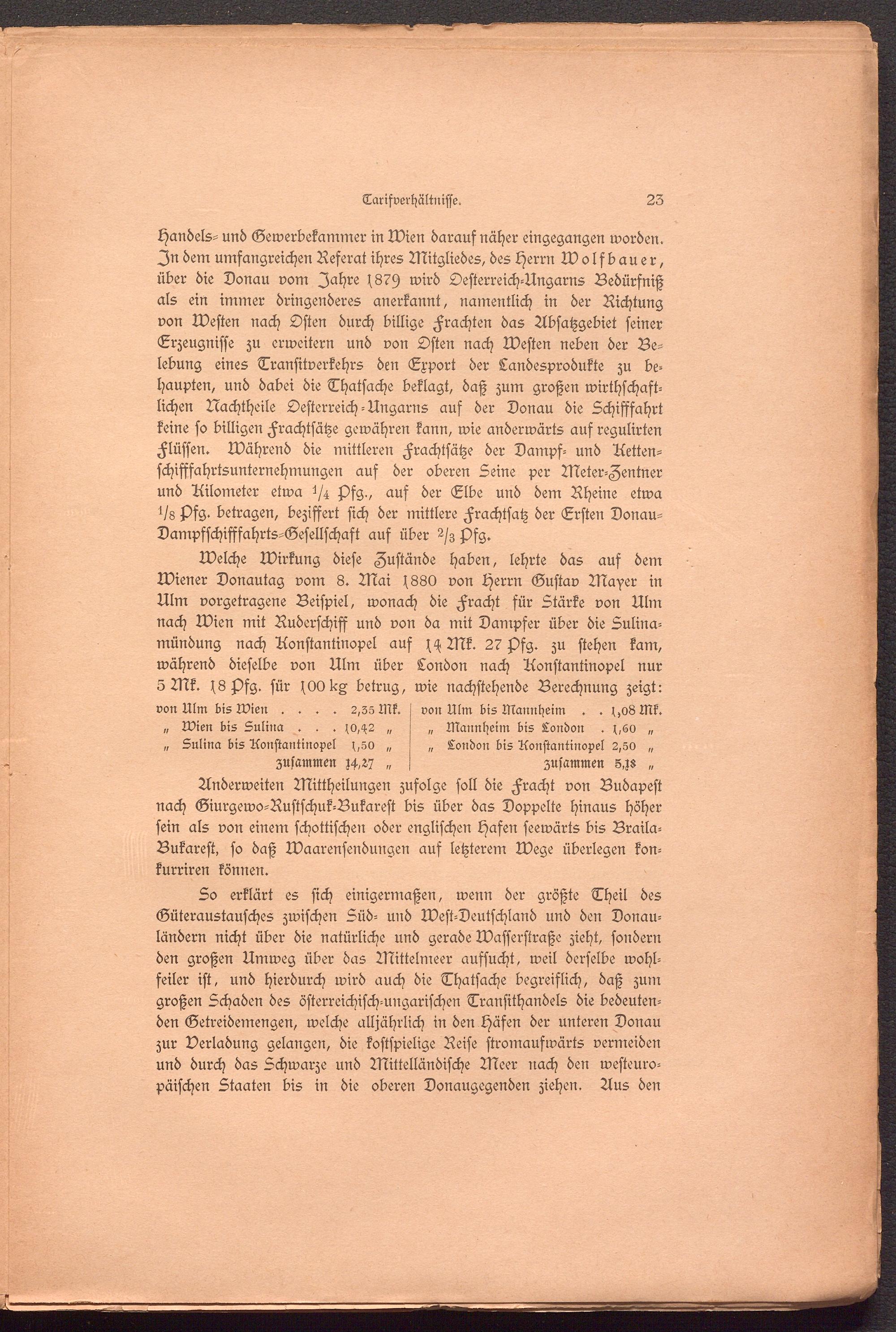 Welche Wirkung diese Zustände haben, lehrte das aus dem Wiener Donautag vom 8. Mai ^880 von Herrn Gustav Mayer in Ulm vorgetragene Beispiel, wonach die Fracht für Stärke von Ulm nach Wien mit Ruderschiff und von da mit Dampfer über die Sulina- mündung nach Aonstantinopel auf ^ Mk. 27 hffg. zu stehen kam, während dieselbe von Ulm über London nach Aonstantinopel nur 5 Mk. ^8h>sg. für W0k§ betrug, wie nachstehende Berechnung zeigt: