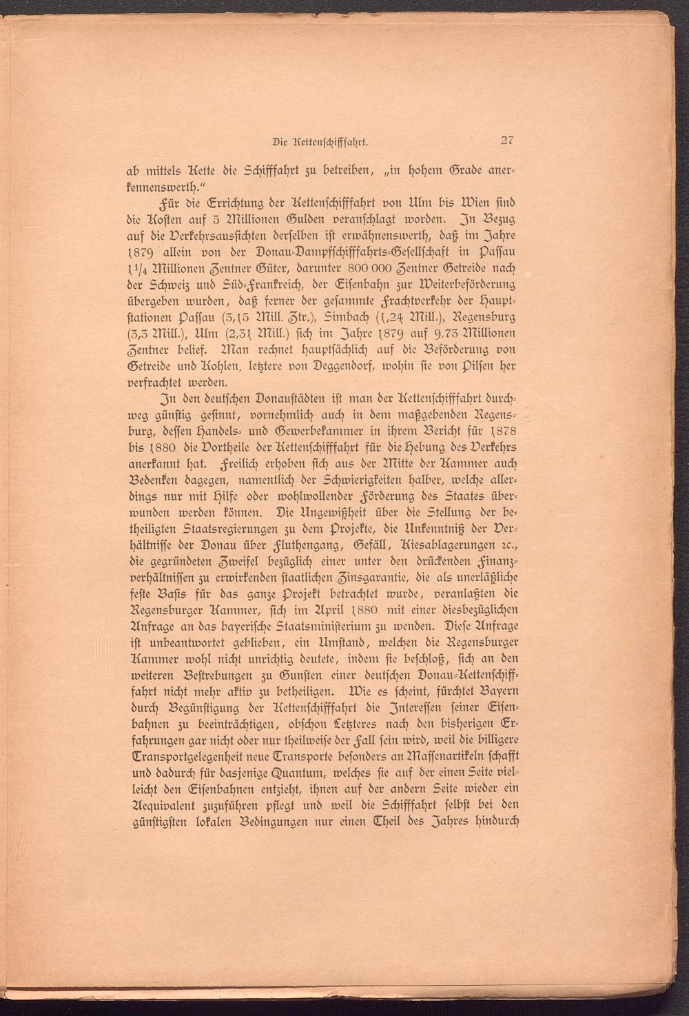 In den deutschen Donaustädten ist man der Aettenschifffahrt durchweg günstig gesinnt, vornehmlich auch in dem maßgebenden Regensburg, dessen Handels- und Gewerbekammer in ihrem Bericht für f878 bis f880 die Vortheile der Aettenschifffahrt für die Hebung des Verkehrs anerkannt hat. Freilich erhoben sich aus der Mitte der Aammer auch Bedenken dagegen, namentlich der Schwierigkeiten halber, welche allerdings nur mit Hilfe oder wohlwollender Förderung des Staates überwunden werden können. Die Ungewißheit über die Stellung der be- theiligten Staatsregierungen zu dem Hrojekte, die Unkenntniß der Verhältnisse der Donau über Fluthengang, Gesäll, Aiesablagerungen rc., die gegründeten Zweifel bezüglich einer unter den drückenden Finanzverhältnissen zu erwirkenden staatlichen Zinsgarantie, die als unerläßliche feste Basis für das ganze Hrojekt betrachtet wurde, veranlaßten die Regensburger Aammer, sich im April H880 mit einer diesbezüglichen Anfrage an das bayerische Staatsministerium zu wenden. Diese Anfrage ist unbeantwortet geblieben, ein Umstand, welchen die Regensburger Aammer wohl nicht unrichtig deutete, indem sie beschloß, sich an den weiteren Bestrebungen zu Gunsten einer deutschen Donau-Aettenschiff- fahrt nicht mehr aktiv zu betheiligen. Wie es scheint, fürchtet Bayern durch Begünstigung der Aettenschifffahrt die Interessen seiner Eisenbahnen zu beeinträchtigen, obschon Letzteres nach den bisherigen Erfahrungen gar nicht oder nur theilweise der Fall sein wird, weil die billigere Transportgelegenheit neue Transporte besonders an Massenartikeln schafft und dadurch für dasjenige Quantum, welches sie auf der einen Seite vielleicht den Eisenbahnen entzieht, ihnen auf der andern Seite wieder ein Aequivalent zuzuführen pflegt und weil die Schifffahrt selbst bei den günstigsten lokalen Bedingungen nur einen Theil des Jahres hindurch