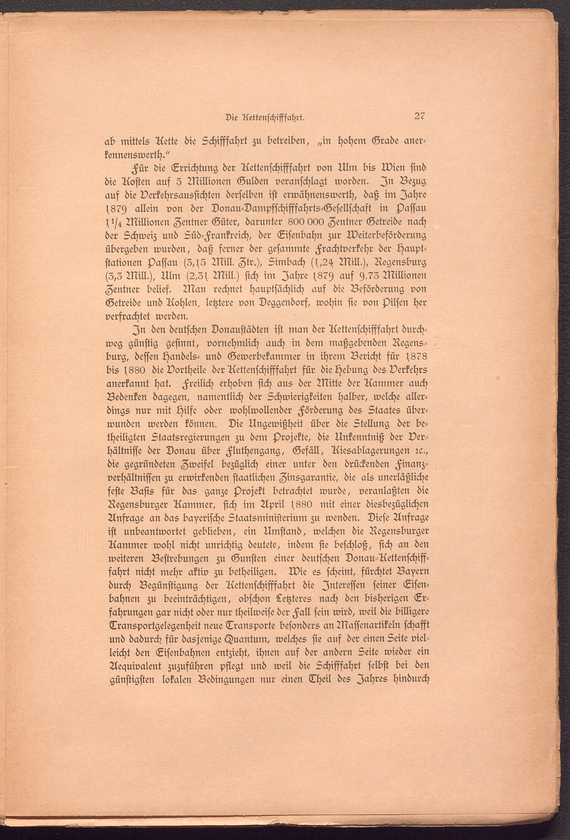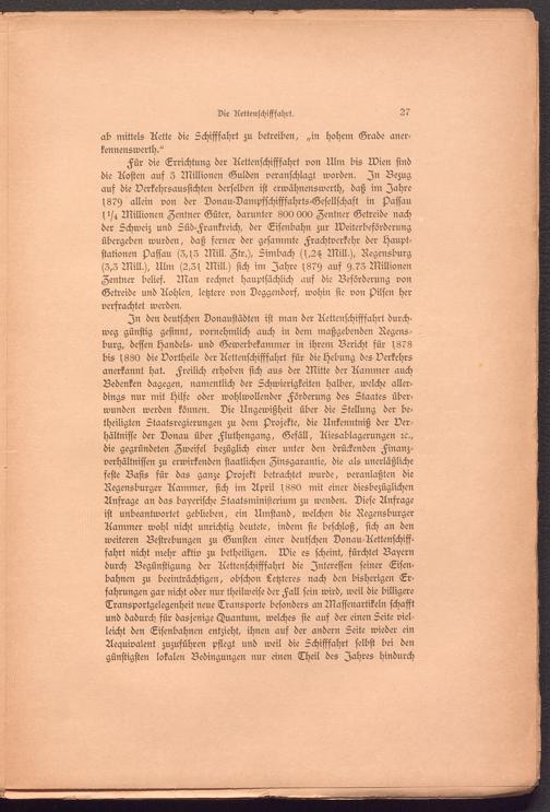 Für die Errichtung der Aettenschifffahrt von Ulm bis N)ien sind die Aosten auf 5 Millionen Gulden veranschlagt worden. In Bezug auf die Verkehrsaussichten derselben ist erwähnenswert!), daß im Jahre s 879 allein von der Donau-Dampfschifffahrts-Gesellfchaft in Hasfau s i /4 Millionen Zentner Güter, darunter 800 000 Zentner Getreide nach der Schweiz und Süd-Frankreich, der Eisenbahn zur Weiterbeförderung übergeben wurden, daß ferner der gesammte Frachtverkehr der Hauptstationen Hassau (3I5 UM. Ztr.), Simbach (s,2^ Mill.), Regensburg (3,3 UM.), Ulm (2,3 f Mill.) sich im Jahre H879 aus 9,73 Millionen Zentner beließ Man rechnet hauptsächlich aus die Beförderung von Getreide und Aohlen, letztere von Deggendorf, wohin sie von Hülsen her verfrachtet werden.