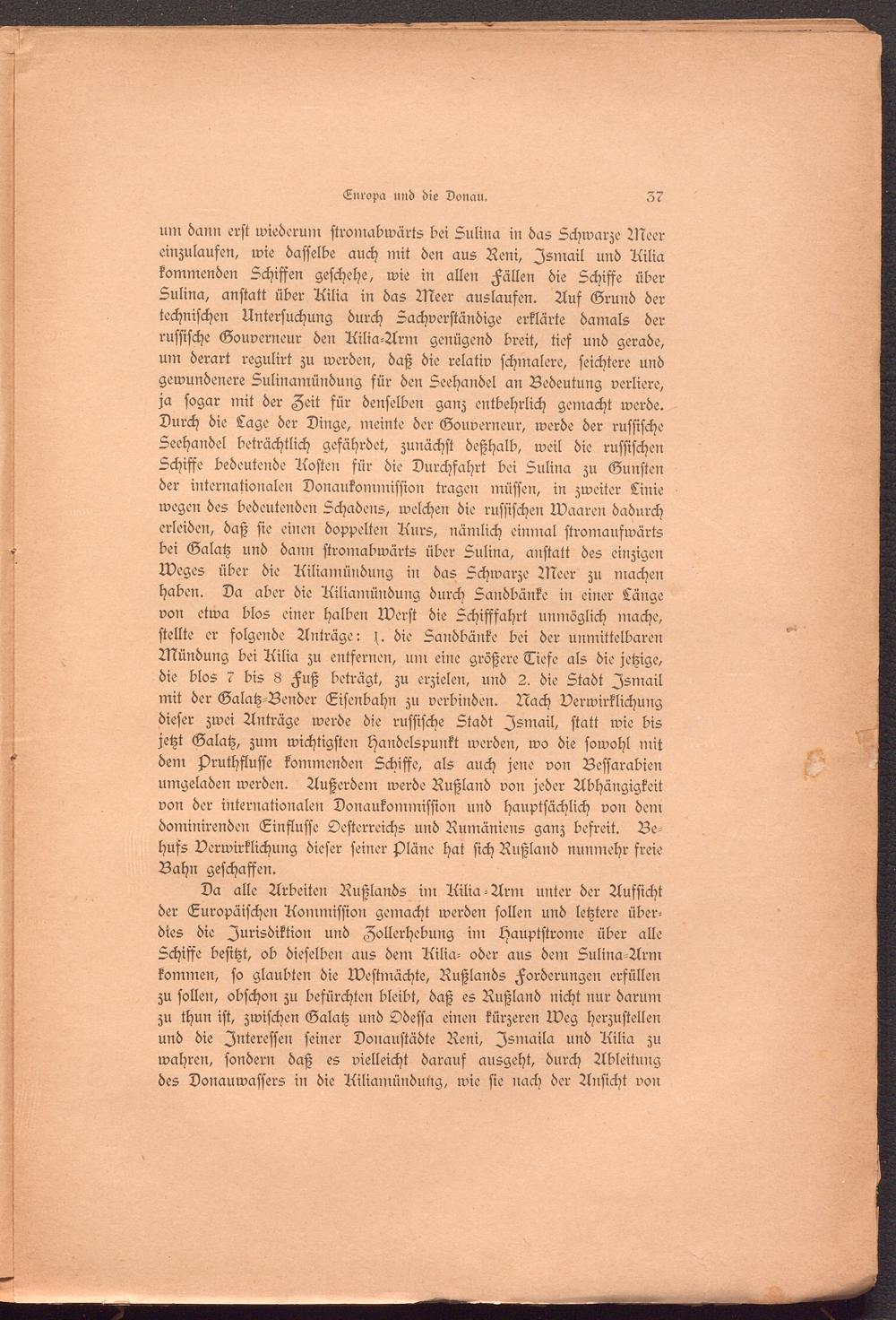 um dann erst wiederum stromabwärts bei Sulina in das Schwarze Meer einzulaufen, wie dasselbe auch mit den aus Reni, Ismail und Ailia kommenden Schiffen geschehe, wie in allen Fällen die Schiffe über Sulina, anstatt über Ailia in das Meer auslausen. Aus Grund der technischen Untersuchung durch Sachverständige erklärte damals der russische Gouverneur den Ailia-Arm genügend breit, tief und gerade, um derart regulirt zu werden, daß die relativ schmalere, seichtere und gewundenere Sulinamündung für den Seehandel an Bedeutung verliere, ja sogar mit der Zeit für denselben ganz entbehrlich gemacht werde. Durch die Tage der Dinge, meinte der Gouverneur, werde der russische Seehandel beträchtlich gefährdet, zunächst deßhalb, weil die russischen Schiffe bedeutende Aasten für die Durchfahrt bei Sulina zu Gunsten der internationalen Donaukommission tragen müssen, in zweiter Linie wegen des bedeutenden Schadens, welchen die russischen Maaren dadurch erleiden, daß sie einen doppelten Aurs, nämlich einmal stromaufwärts bei Galatz und dann stromabwärts über Sulina, anstatt des einzigen Meges über die Ailiamündung in das Schwarze Meer zu machen haben. Da aber die Ailiamündung durch Sandbänke in einer Länge von etwa blos einer halben Merst die Schiffsahrt unmöglich mache, stellte er folgende Anträge: die Sandbänke bei der unmittelbaren