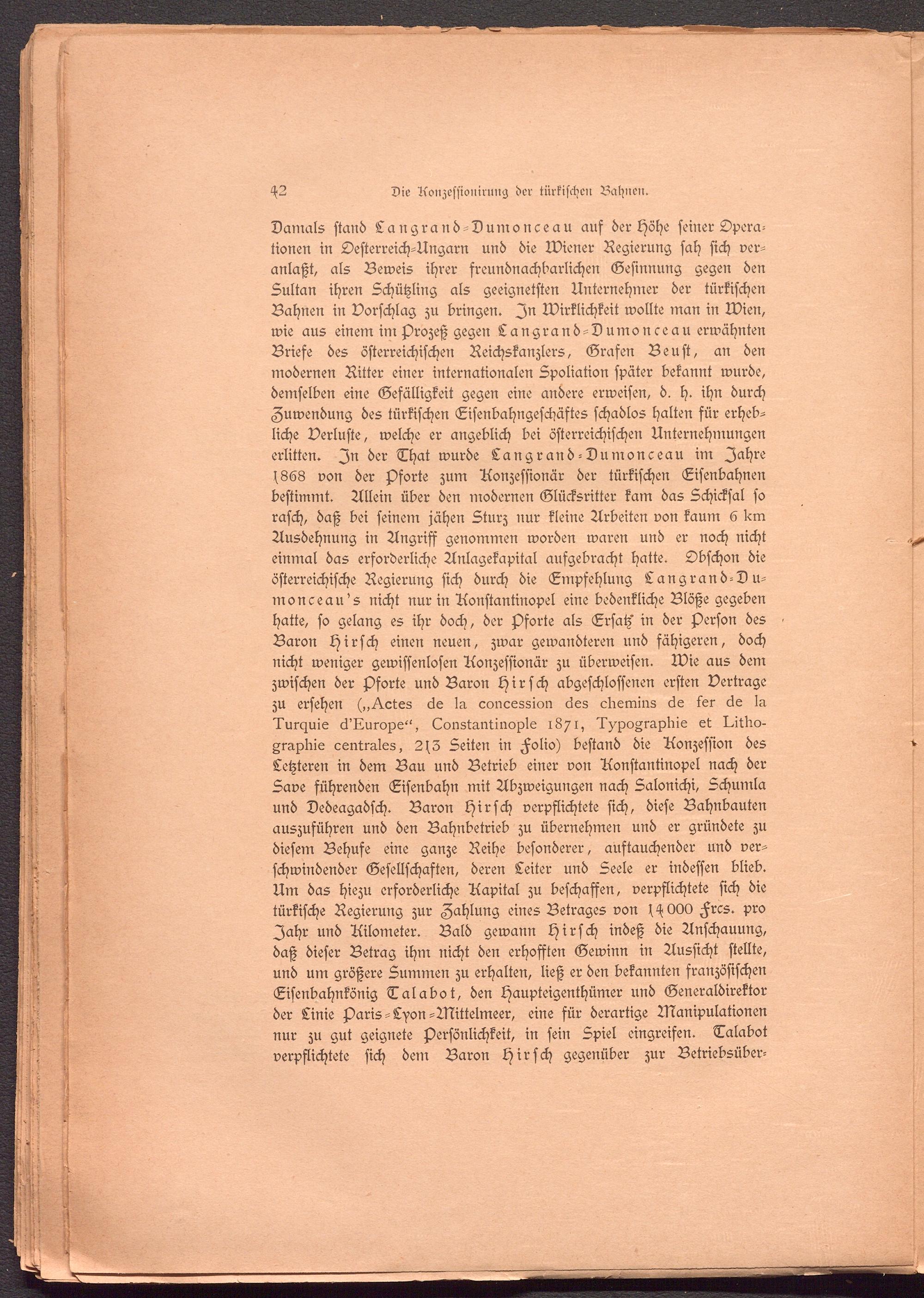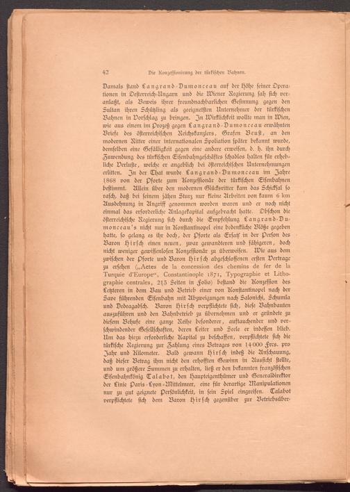 Damals stand Langrand-Dumonceau auf der Höhe seiner Operationen in Oesterreich-Ungarn und die Wiener Regierung sah sich veranlaßt, als Beweis ihrer sreundnachbarlichen Gesinnung gegen den Sultan ihren Schützling als geeignetsten Unternehmer der türkischen Bahnen in Borschlag zu bringen. In Wirklichkeit wollte man in Wien, wie aus einem ini Prozeß gegen Langrand-Dumonceau erwähnten Briese des österreichischen Reichskanzlers, Grafen Beust, an den modernen Ritter einer internationalen Spoliation später bekannt wurde, demselben eine Gefälligkeit gegen eine andere erweisen, d. h. ihn durch Zuwendung des türkischen Eisenbahngeschäftes schadlos halten für erhebliche Verluste, welche er angeblich bei österreichischen Unternehmungen erlitten. In der That wurde Langrand-Dumonceau im Jahre s868 von der Pforte zum Aonzessionär der türkischen Eisenbahnen bestimmt. Allein über den modernen Glücksritter kam das Schicksal so rasch, daß bei seinem jähen Sturz nur kleine Arbeiten von kaum 6 l<m Ausdehnung in Angriff genommen worden waren und er noch nicht einmal das erforderliche Anlagekapital aufgebracht hatte. Obschon die österreichische Regierung sich durch die Empfehlung Langrand-Du- monceau's nicht nur in Aonstantinopel eine bedenkliche Blöße gegeben hatte, so gelang es ihr doch, der Pforte als Ersatz' in der Person des . Baron Hirsch einen neuen, zwar gewandteren und fähigeren, doch nicht weniger gewissenlosen Aonzessionär zu überweisen. Wie aus dem zwischen der Pforte und Baron Hirsch abgeschlossenen ersten Vertrage zu ersehen („^.ctes 6e In concession cles cbemins 6e ter cke lu Tur^uie ck'Aurope", LonstaMinople 1871, Typographie et Imbo- graplne ventrales, 2 s 3 Seiten in Folio) bestand die Aonzession des Letzteren in dem Bau und Betrieb einer von Aonstantinopel nach der Save führenden Eisenbahn mit Abzweigungen nach Salonichi, Schumla und Dedeagadsch. Baron Hirsch verpflichtete sich, diese Bahnbauten auszuführen und den Bahnbetrieb zu übernehmen und er gründete zu diesem Behufe eine ganze Reihe besonderer, auftauchender und verschwindender Gesellschaften, deren Leiter und Seele er indessen blieb. Um das hiezu erforderliche Aapital zu beschaffen, verpflichtete sich die türkische Regierung zur Zahlung eines Betrages von s^OOO Frcs. pro Jahr und Ailometer. Bald gewann Hirsch indeß die Anschauung, daß dieser Betrag ihm nicht den erhofften Gewinn in Aussicht stellte, und um größere Summen zu erhalten, ließ er den bekannten französischen Eisenbahnkönig Talabot, den Haupteigenthümer und Generaldirektor der Linie Paris-Lyon-Mittelmeer, eine für derartige Manipulationen nur zu gut geignete Persönlichkeit, in sein Spiel eingreifen. Talabot verpflichtete sich dem Baron Hirsch gegenüber zur Betriebsüber-