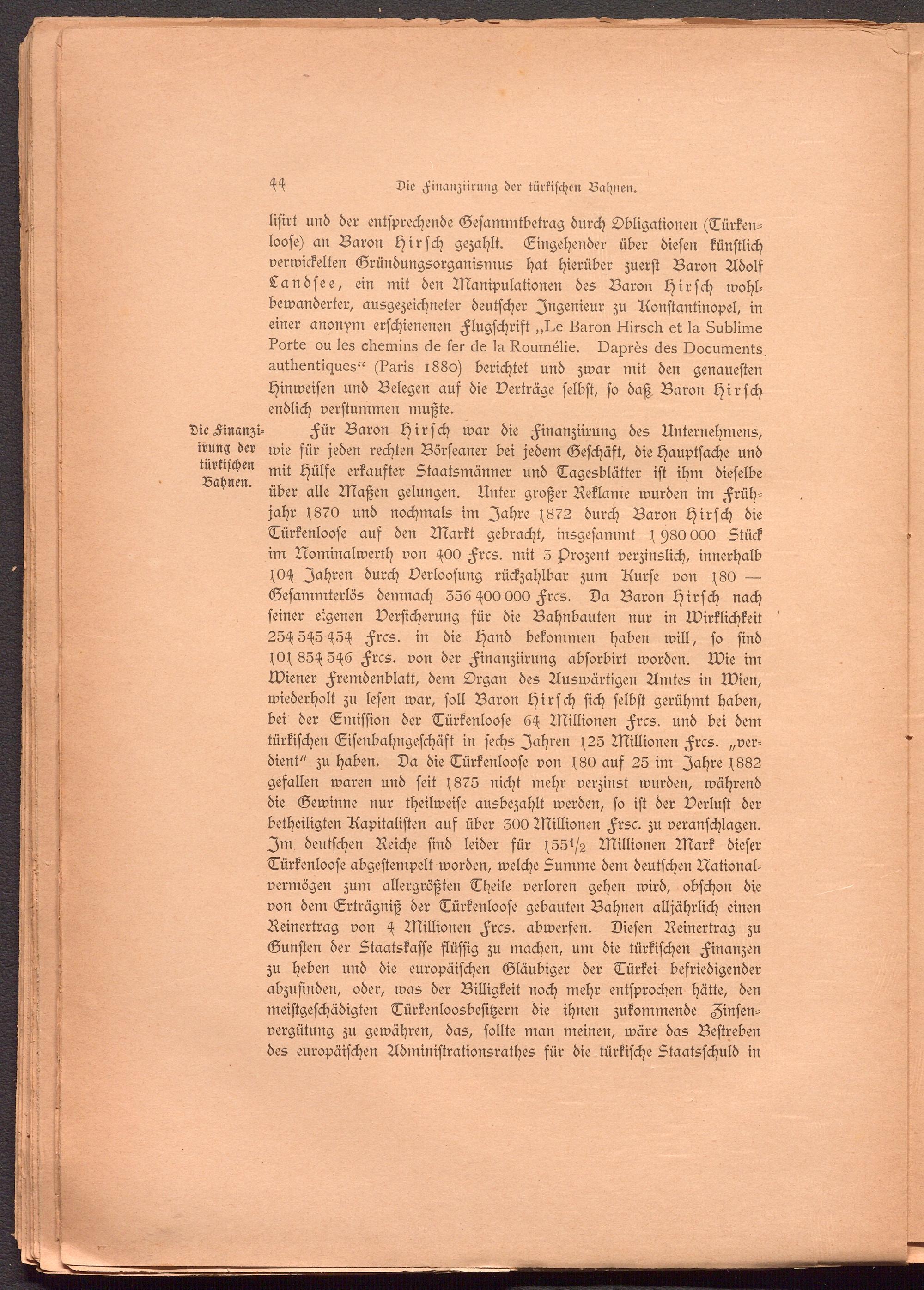 lisirt und der entsprechende Gesammtbetrag durch Obligationen (Türken- loose) an Baron pirsch gezahlt. Eingehender über diesen künstlich verwickelten Gründungsorganismus hat hierüber zuerst Baron Adols Landsee, ein mit den Manipulationen des Baron Hirsch wohlbewanderter, ausgezeichneter deutscher Ingenieur zu Aonstantinopel, in einer anonym erschienenen Flugschrift Baron blir3cb et la Sublime Borte ou les cbemin3 cle ker cle In R.oumeI 1 e. Dapre3 cle8 Document3 autbentic^ue 5 " (?ari 3 1880) berichtet und zwar mit den genauesten Hinweisen und Belegen aus die Verträge selbst, so daß Baron Hirsch endlich verstummen mußte.
