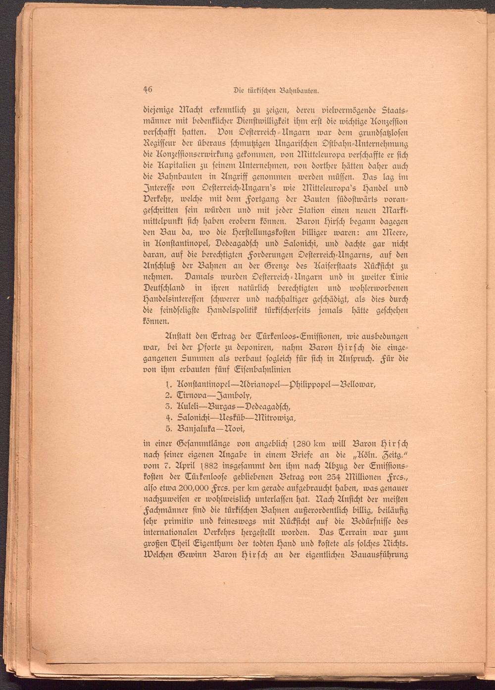 Anstatt den Ertrag der Türkenloos-Emissionen, wie ausbedungen war, bei der Hfforte zu deponiren, nahm Baron Hirsch die eingegangenen Summen als verbaut sogleich für sich in Anspruch. Für die von ihm erbauten fünf Eisenbahnlinien