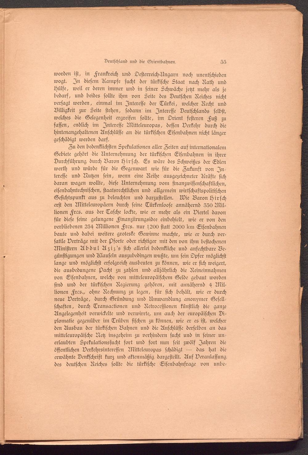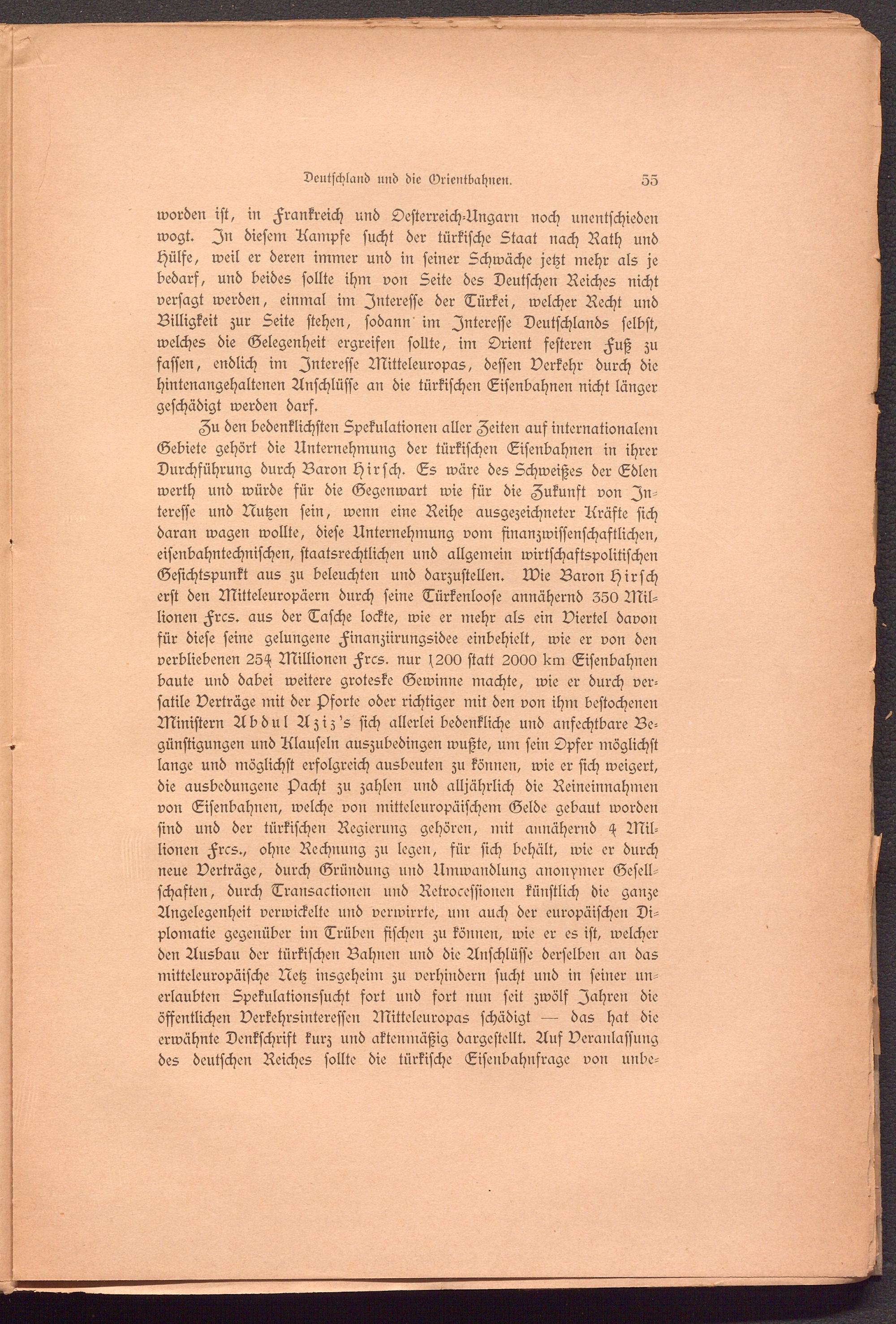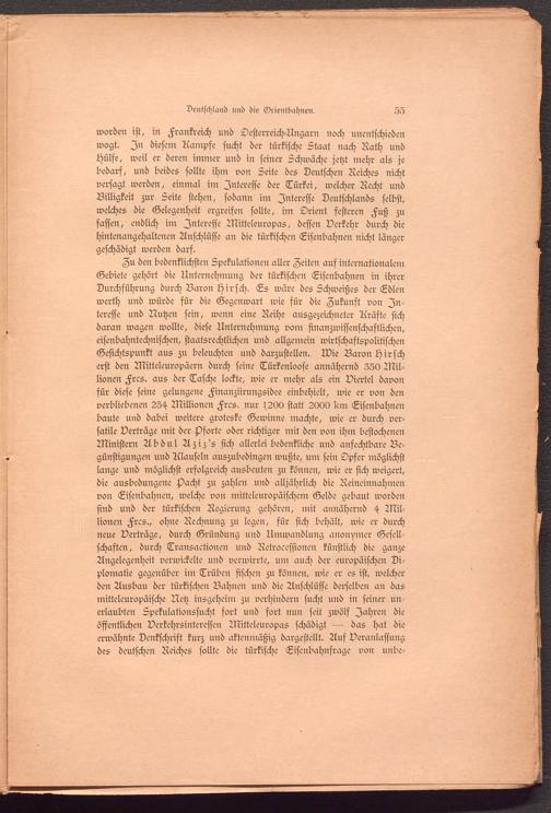 worden ist, in Frankreich und Oesterreich-Ungarn noch unentschieden wogt. In diesem Kämpfe sucht der türkische Staat nach Rath und Hülfe, weil er deren immer und in seiner Schwäche jetzt mehr als je bedarf, und beides sollte ihm von Seite des Deutschen Reiches nicht versagt werden, einmal im Interesse der Türkei, welcher Recht und Billigkeit zur Seite stehen, sodann im Interesse Deutschlands selbst, welches die Gelegenheit ergreifen sollte, im Orient festeren Fuß zu fassen, endlich im Interesse Mitteleuropas, dessen Verkehr durch die hintenangehaltenen Anschlüsse an die türkischen Eisenbahnen nicht länger geschädigt werden darf.