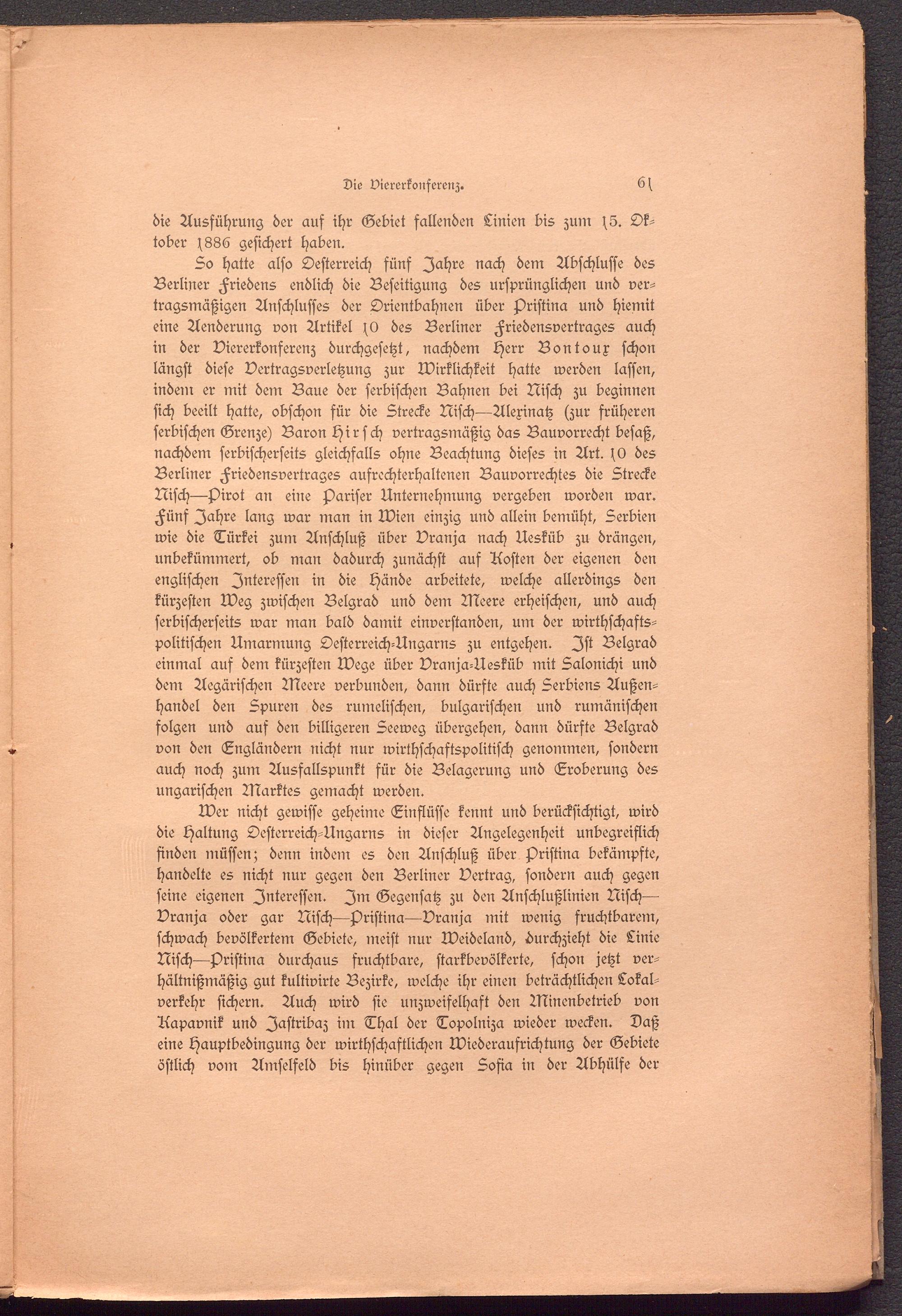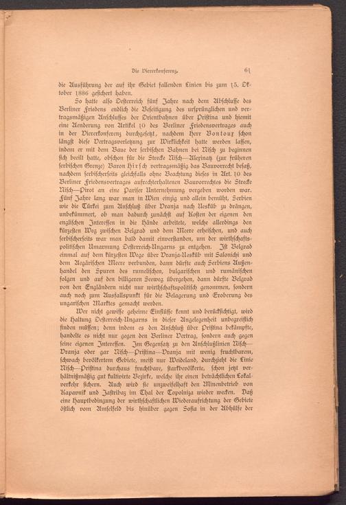 Wer nicht gewisse geheime Einflüsse kennt und berücksichtigt, wird die Haltung Oesterreich-Ungarns in dieser Angelegenheit unbegreiflich finden müssen; denn indem es den Anschluß über pristina bekämpfte, handelte es nicht nur gegen den Berliner Vertrag, sondern auch gegen seine eigenen Interessen. Im Gegensatz zu den Anschlußlinien Nisch— Vranja oder gar Nisch—pristina—Vranja mit wenig fruchtbarem, schwach bevölkertem Gebiete, meist nur Weideland, durchzieht die Linie Nisch—pristina durchaus fruchtbare, starkbevölkerte, schon jetzt ver- hältnißmäßig gut kultivirte Bezirke, welche ihr einen beträchtlichen Lokalverkehr sichern. Auch wird sie unzweifelhaft den UUnenbetrieb von Uapavnik und Jastribaz im Thal der Topolniza wieder wecken. Daß eine Hauptbedingung der wirthschastlichen Wiederausrichtung der Gebiete östlich vom Amselseld bis hinüber gegen Sofia in der Abhülfe der
