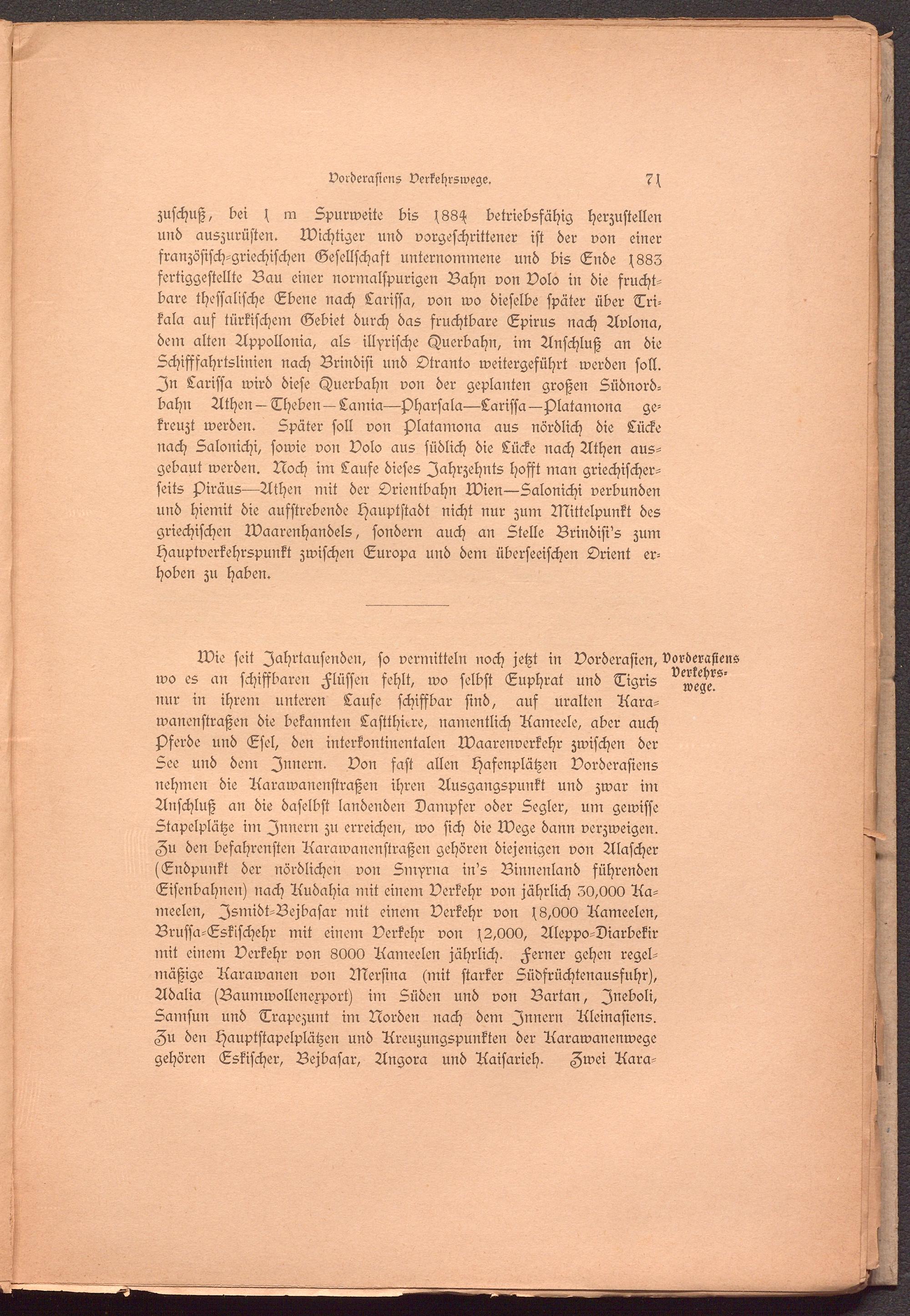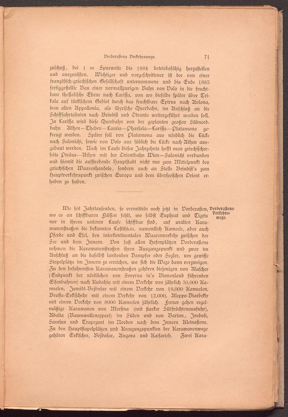Wie seit Jahrtausenden, so vermitteln noch jetzt in Vorderasien, vorderafiens wo es an schiffbaren Flüssen fehlt, wo selbst Euphrat und Tigris nur in ihrem unteren Laufe schiffbar sind, aus uralten Aara- wanenstraßen die bekannten Lastthiere, namentlich Aameele, aber auch Hfferde und Esel, den interkontinentalen Warenverkehr zwischen der See und dem Innern. Von fast allen Hasenplätzen Vorderafiens nehmen die Aarawanenstraßen ihren Ausgangspunkt und zwar im Anschluß an die daselbst landenden Dampfer oder Segler, um gewisse Stapelplätze in: Innern zu erreichen, wo sich die Wege dann verzweigen.