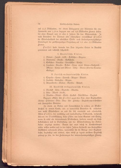 In einem an Boden- und Naturschätzen so reichen, an Wasserstraßen so armen Lande, wie es namentlich Anatolien ist, erscheinen nun wohl Eisenbahnen an und für sich erwünscht und erforderlich. Allein st)reffel, der vorsichtige und landeskundige Volkswirth, versprach sich von der Verwirklichung dieser st)läne nur dann Gewinn und Erfolg, wenn sie nicht als internationale Weltbahnen, sondern vorerst als bloße Lokalbahnen und in Verbindung mit der Wiederbelebung der Bodenkultur angelegt werden. Davon hat man indeß in Aonstantinopel nichts wissen wollen und in den letzten Jahren theilweise aus strategischen Rücksichten anderweite st)läne, namentlich für die Anlage einer Euphrat- bahn, begünstigt und erörtert, ohne indeß zu irgend welchem Ergebniß gelangt zu sein, da den Forderungen der unternehmungslustigen Finanz-