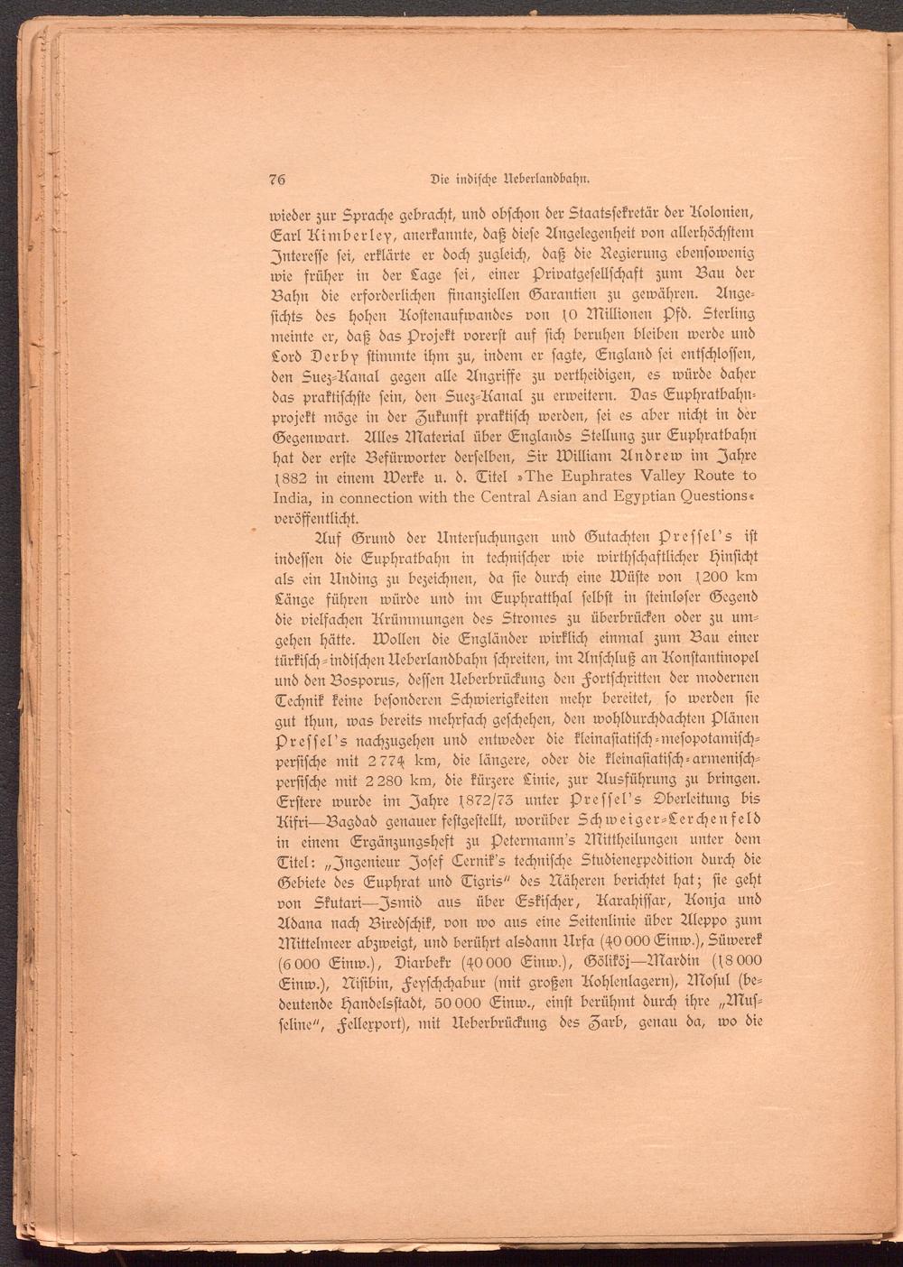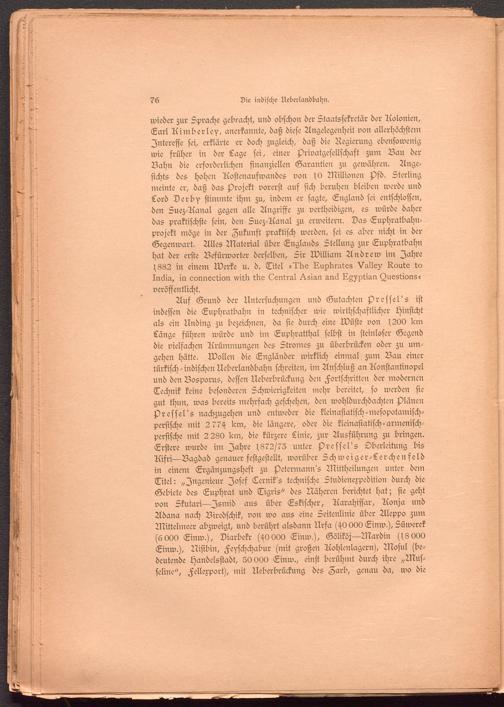 wieder zur Sprache gebracht, und obschon der Staatssekretär der Aolonien, Earl Aimberley, anerkannte, daß diese Angelegenheit von allerhöchstem Interesse sei, erklärte er doch zugleich, daß die Regierung ebensowenig wie früher in der Lage sei, einer Privatgesellschaft zum Bau der Bahn die erforderlichen finanziellen Garantien zu gewähren. Angesichts des hohen Aostenaufwandes von fO Millionen s)fd. Sterling meinte er, daß das Projekt vorerst auf sich beruhen bleiben werde und Lord Derb-f stimmte ihm zu, indem er sagte, England sei entschlossen, den Suez-Aanal gegen alle Angriffe zu vertheidigen, es würde daher das praktischste sein, den Suez-Aanal zu erweitern. Das Euphratbahn- projekt möge in der Zukunft praktisch werden, sei es aber nicht in der Gegenwart. Alles Material über Englands Stellung zur Euphratbahn hat der erste Befürworter derselben, Sir William Andrew im Jahre s882 in einem Werke u. d. Titel »1Ae Aupbrates Valley Route to In6m, in cormection vvitb tbe Zentral ^.sian and R^ptian tZuestions« veröffentlicht.