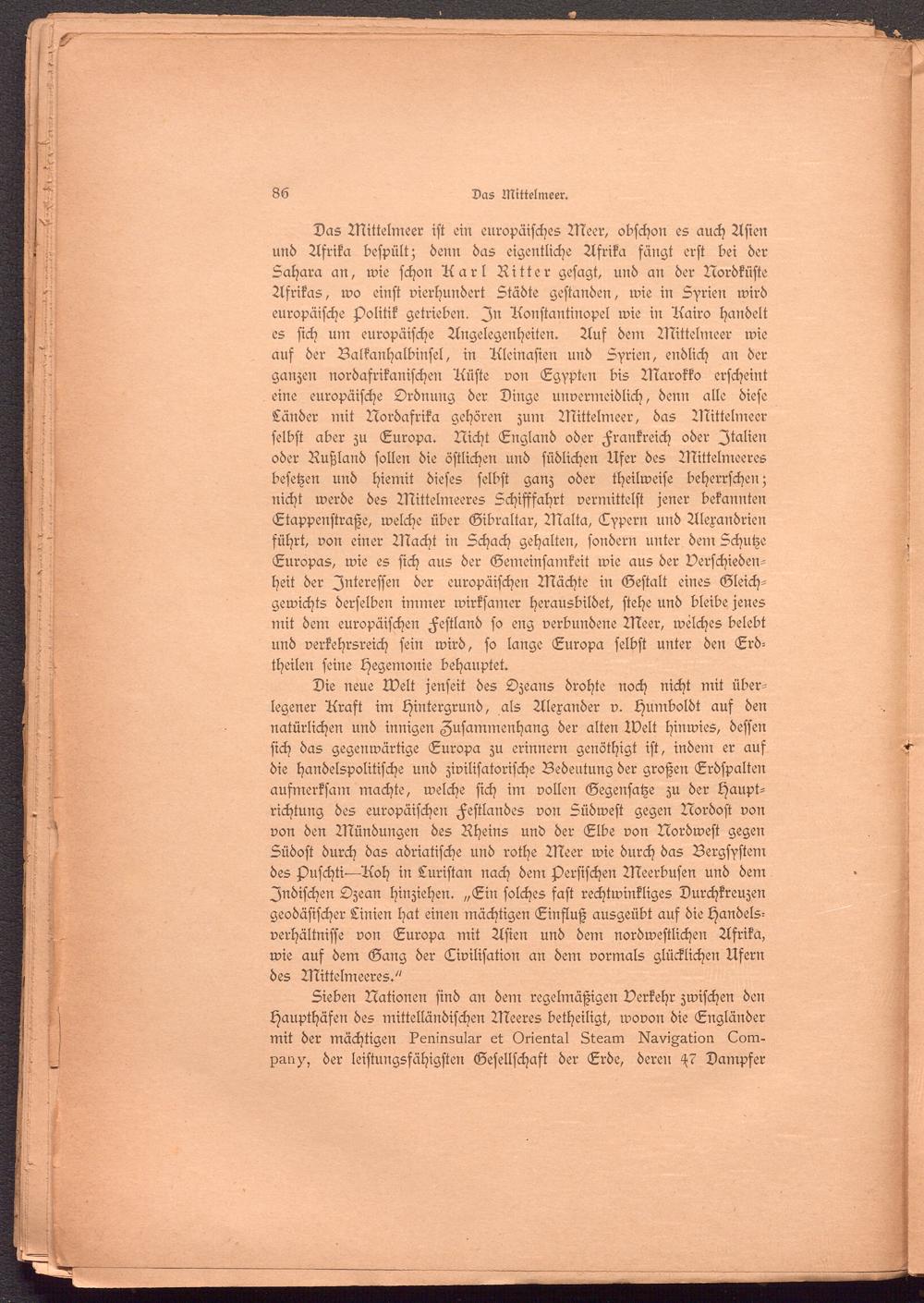 Das Mittelmeer ist ein europäisches Meer, obschon es auch Asien und Afrika bespült; denn das eigentliche Afrika sängt erst bei der Sahara an, wie schon Aarl Ritter gesagt, und an der Nordküste Afrikas, wo einst vierhundert Städte gestanden, wie in Syrien wird europäische Politik getrieben. In Aonstantinopel wie in Aairo handelt es sich um europäische Angelegenheiten. Auf dem Mittelmeer wie auf der Balkanhalbinsel, in Aleinasien und Syrien, endlich an der ganzen nordasrikanischen Aüste von Egypten bis Marokko erscheint eine europäische Ordnung der Dinge unvermeidlich, denn alle diese Länder mit Nordafrika gehören zum Mittelmeer, das Mittelmeer selbst aber zu Europa. Nicht England oder Frankreich oder Italien oder Rußland sollen die östlichen und südlichen Ufer des Mittelmeeres besetzen und hiemit dieses selbst ganz oder theilweise beherrschen; nicht werde des Mittelmeeres Schisfsahrt vermittelst jener bekannten Etappenstraße, welche über Gibraltar, Malta, Eypern und Alexandrien führt, von einer Macht in Schach gehalten, sondern unter dem Schutze Europas, wie es sich aus der Gemeinsamkeit wie aus der Verschiedenheit der Interessen der europäischen Mächte in Gestalt eines Gleichgewichts derselben immer wirksamer herausbildet, stehe und bleibe jenes mit dem europäischen Festland so eng verbundene Meer, welches belebt und verkehrsreich sein wird, so lange Europa selbst unter den Erdtheilen seine Hegemonie behauptet.