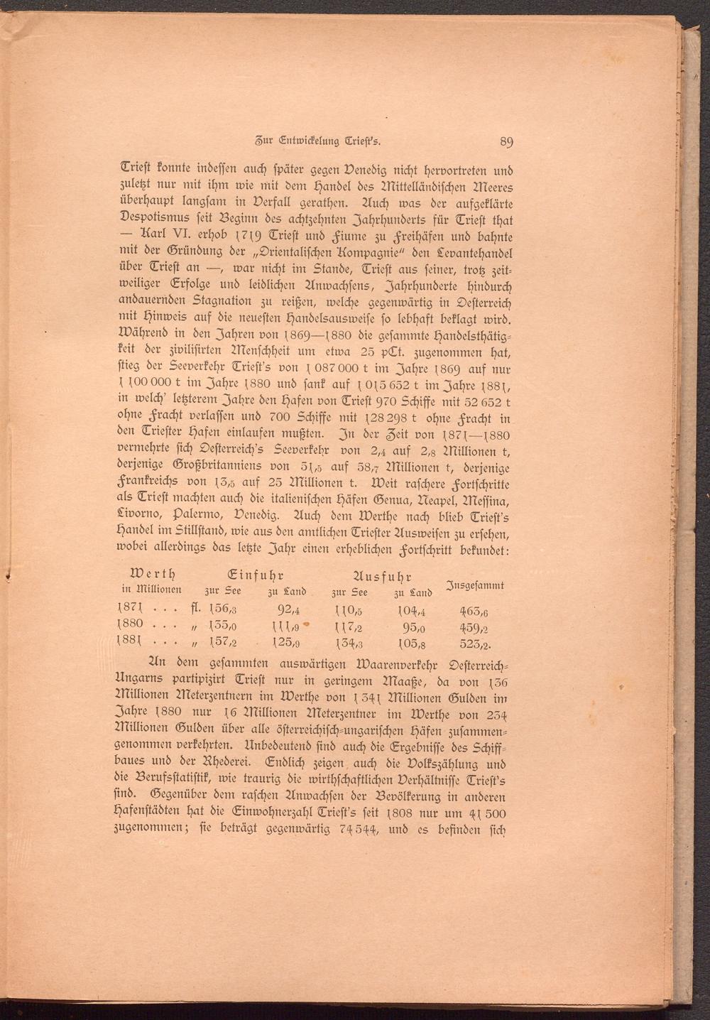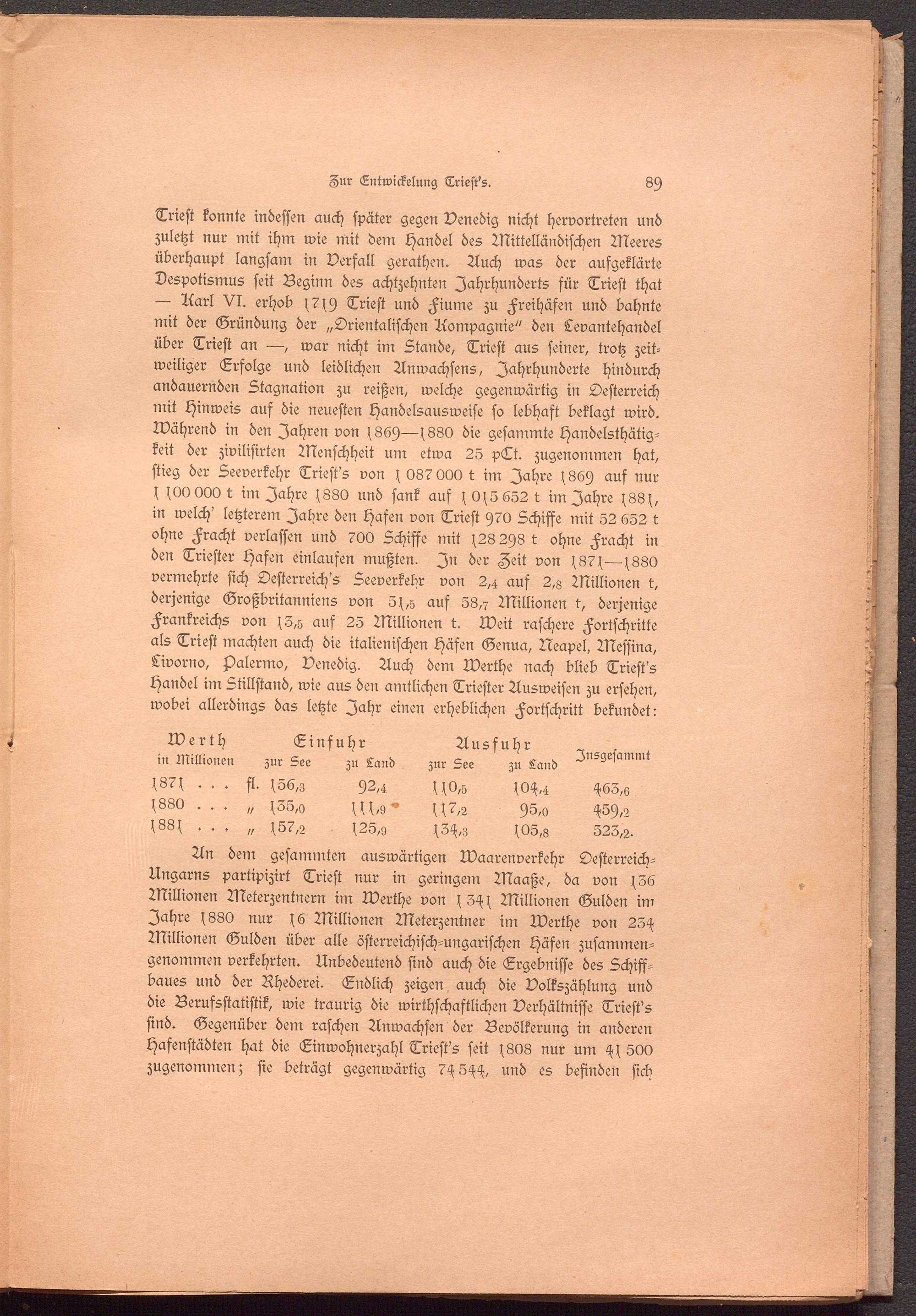 An dem gesummten auswärtigen Warenverkehr Oesterreich- Ungarns partipizirt Trieft nur in geringem Maaße, da von f36 Millionen Meterzentnern im Werthe von f3^f Millionen Gulden im Jahre f880 nur Millionen Meterzentner im Werthe von 23^f Millionen Gulden über alle österreichisch-ungarischen Häfen zusammengenommen verkehrten. Unbedeutend sind auch die Ergebnisse des Schiffbaues und der Rhederei. Endlich zeigen auch die Volkszählung und die Berufsstatistik, wie traurig die wirthschaftlichen Verhältnisse Triest's sind. Gegenüber dem raschen Anwachsen der Bevölkerung in anderen Hafenstädten hat die Einwohnerzahl Triest's seit f808 nur um 500 zugenommen; sie beträgt gegenwärtig 7^5^, und es befinden sich