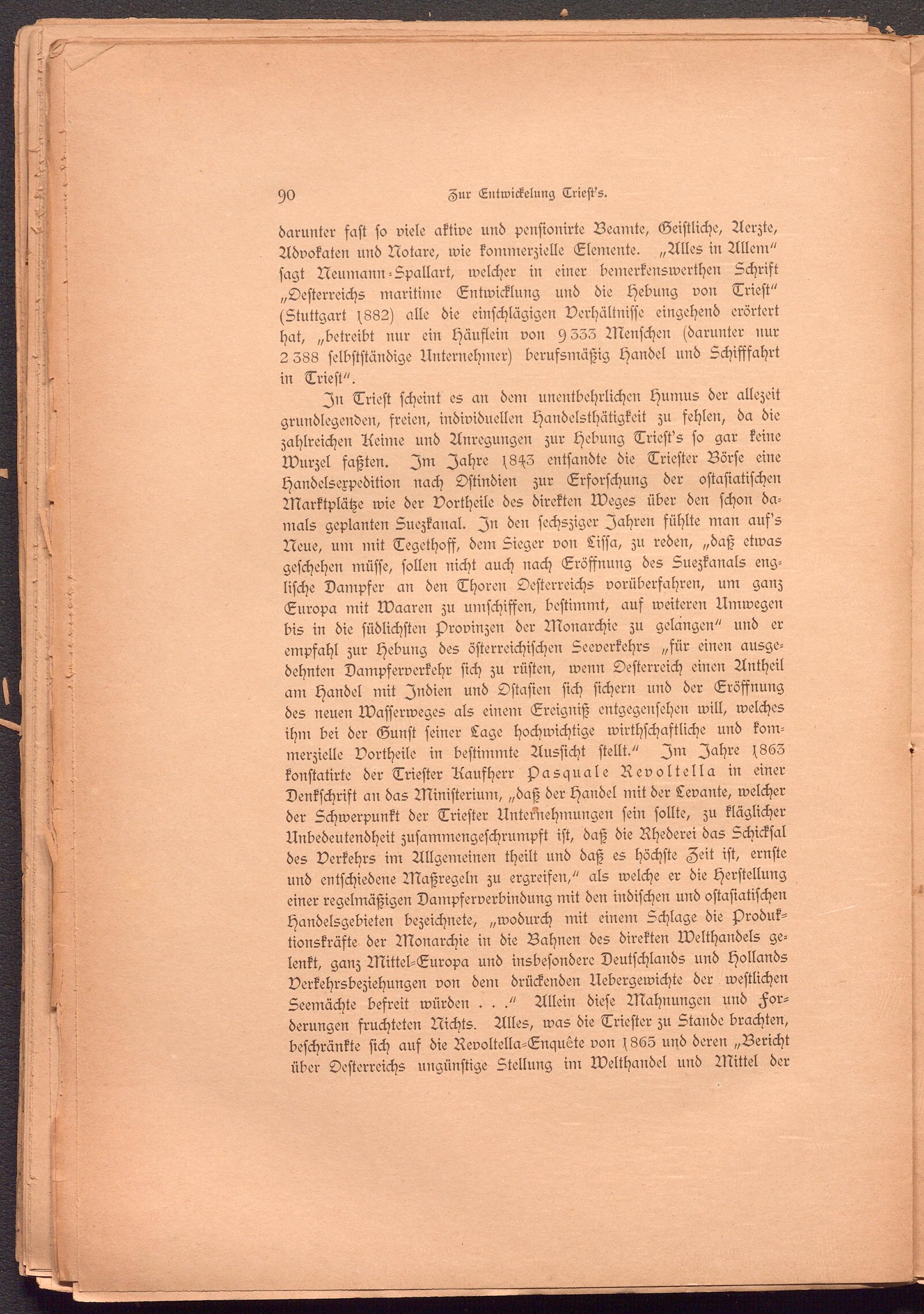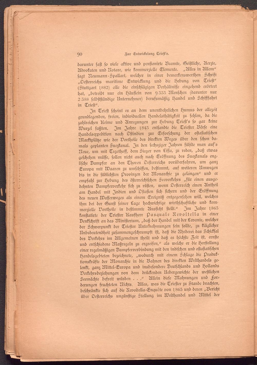 In Trieft scheint es an dem unentbehrlichen Humus der allezeit grundlegenden, freien, individuellen Handelsthätigkeit zu fehlen, da die zahlreichen Aeime und Anregungen zur Hebung Triest's so gar keine Wurzel faßten. Im Jahre (8^3 entsandte die Triester Börse eine Handelsexpedition nach Ostindien zur Erforschung der ostasiatischen Marktplätze wie der Vortheile des direkten Weges über den schon damals geplanten Suezkanal. In den sechsziger Jahren fühlte man auf's Neue, um mit Tegethosf, dem Sieger von Lissa, zu reden, „daß etwas geschehen müsse, sollen nicht auch nach Eröffnung des Suezkanals englische Dampfer an den Thoren Oesterreichs vorübersahren, um ganz Europa mit Waaren zu umschiffen, bestimmt, aus weiteren Umwegen bis in die südlichsten Provinzen der Monarchie zu gelangen" und er empfahl zur Hebung des österreichischen Seeverkehrs „für einen ausgedehnten Dampserverkehr sich zu rüsten, wenn Oesterreich einen Antheil am Handel mit Indien und Ostasien sich sichern und der Eröffnung des neuen Wasserweges als einem Ereigniß entgegensehen will, welches ihm bei der Gunst seiner Lage hochwichtige wirthschaftliche und kommerzielle Vortheile in bestimmte Aussicht stellt." Im Jahre (863 konftatirte der Triester Aausherr Aasquale Revoltella in einer Denkschrift an das Ministerium, „daß der Handel mit der Levante, welcher der Schwerpunkt der Triester Unternehmungen sein sollte, zu kläglicher Unbedeutendheit zusammengeschrumpft ist, daß die Ahederei das Schicksal des Verkehrs im Allgemeinen theilt und daß es höchste Zeit ist, ernste und entschiedene Maßregeln zu ergreifen," als welche er die Herstellung einer regelmäßigen Dampserverbindung mit den indischen und ostasiatischen Handelsgebieten bezeichnete, „wodurch mit einem Schlage die Aroduk- tionskräfte der Monarchie in die Bahnen des direkten Welthandels gelenkt, ganz Mittel-Europa und insbesondere Deutschlands und Hollands Verkehrsbeziehungen von dem drückenden Uebergewichte der westlichen Seemächte befreit würden ..." Allein diese Mahnungen und Forderungen fruchteten Nichts. Alles, was die Triester zu Stande brachten, beschränkte sich aus die Revoltella-Enquete von (865 und deren „Bericht über Oesterreichs ungünstige Stellung im Welthandel und Mittel der