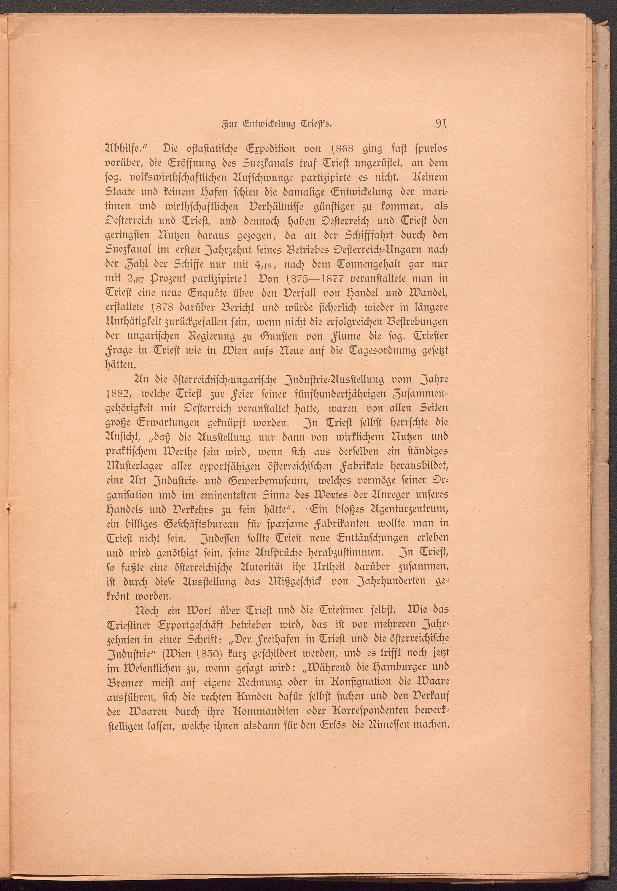 Noch ein Wort über Trieft und die Triestiner selbst. Wie das Triestiner Exportgeschäft betrieben wird, das ist vor mehreren Jahrzehnten in einer Schrift: „Der Freihafen in Trieft und die österreichische Industrie" (Wien 1850) kurz geschildert werden, und es trifft noch jetzt im Wesentlichen zu, wenn gesagt wird: „Während die Hamburger und Bremer meist aus eigene Rechnung oder in Konsignation die Waare ausführen, sich die rechten Runden dafür selbst suchen und den Verkauf der Waaren durch ihre Rommanditen oder Rorrespondenten bewerkstelligen lassen, welche ihnen alsdann für den Erlös die Rimessen machen,