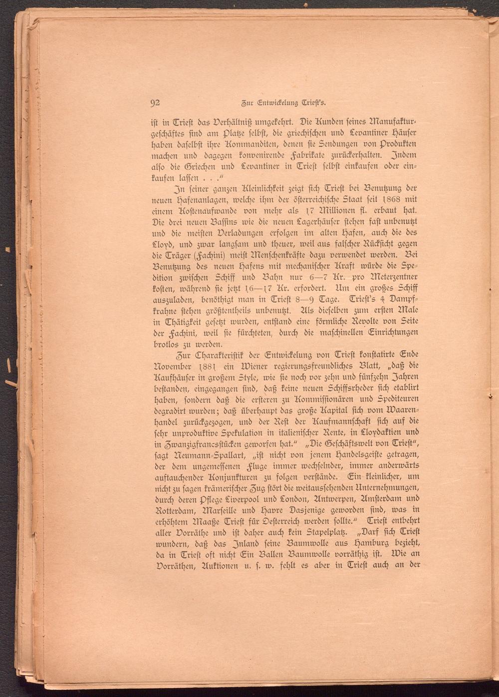 Aaufhäuser in großem Style, wie sie noch vor zehn und fünfzehn Jahren bestanden, eingegangen sind, daß keine neuen Schiffsrheder sich etablirt haben, sondern daß die ersteren zu Aommissionären und Spediteuren degradirt wurden; daß überhaupt das große Aapital sich vom Waaren- handel zurückgezogen, und der Rest der Aaufmannschaft sich auf die sehr unproduktive Spekulation in italienischer Rente, in Lloydaktien und in Zwanzigfrancsstücken geworfen hat." „Die Geschäftswelt von Trieft", sagt Neumann-Spallart, „ist nicht von jenem Handelsgeiste getragen, der dem angemessenen Fluge immer wechselnder, immer anderwärts auftauchender Aonjunkturen zu folgen verstände. Ein kleinlicher, um nicht zu sagen krämerischer Zug stört die weitaussehenden Unternehmungen, durch deren Pflege Liverpool und London, Antwerpen, Amsterdam und Rotterdam, Marseille und Havre Dasjenige geworden sind, was in erhöhtem Maaße Trieft für Oesterreich werden sollte." Trieft entbehrt aller Vorräthe und ist daher auch kein Stapelplatz. „Darf sich Trieft wundern, daß das Inland seine Baumwolle aus Hamburg bezieht, da in Trieft oft nicht Ein Ballen Baumwolle vorräthig ist. Wie an Vorräthen, Auktionen u. s. w. fehlt es aber in Trieft auch an der