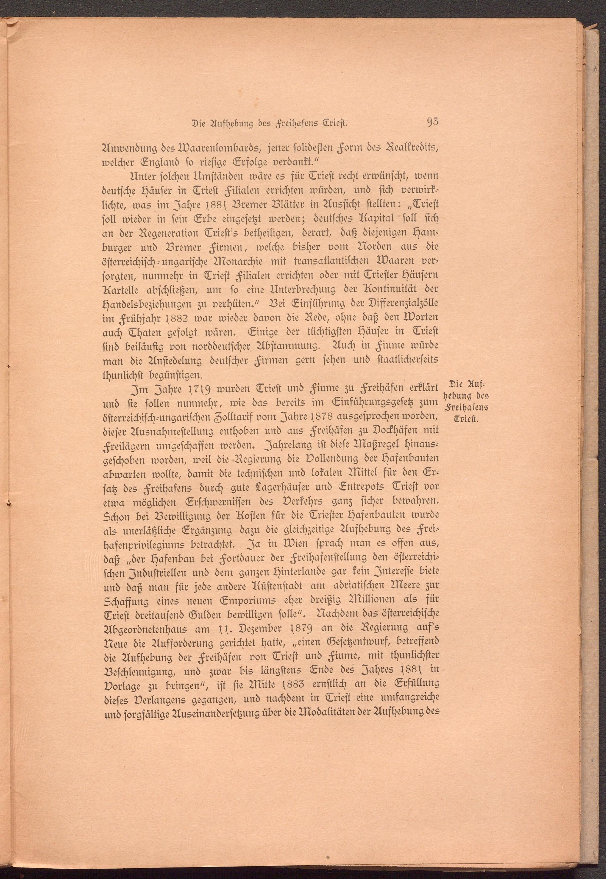 Im Jahre f7s9 wurden Trieft und Fiume zu Freihäfen erklärt und sie sollen nunmehr, wie das bereits in: Einsührungsgesetz zum österreichisch-ungarischen Zolltarif vom Jahre f878 ausgesprochen worden, dieser Ausnahmestellung enthoben und aus Freihäfen zu Dockhäfen mit Freilägern umgeschaffen werden. Jahrelang ist diese Maßregel hinausgeschoben worden, weil die Regierung die Bollendung der Hafenbauten abwarten wollte, damit die technischen und lokalen Mittel für den Ersatz des Freihafens durch gute Lagerhäuser und Entrepots Trieft vor etwa möglichen Erschwernissen des Verkehrs ganz sicher bewahren. Schon bei Bewilligung der Rosten für die Triester Hasenbauten wurde als unerläßliche Ergänzung dazu die gleichzeitige Aushebung des Frei- hasenprivilegiums betrachtet. Ja in Wien sprach man es offen aus, daß „der Hafenbau bei Fortdauer der Freihafenstellung den österreichischen Industriellen und dem ganzen Hinterlands gar kein Interesse biete und daß man für jede andere Rüstenstadt am adriatischen Meere zur Schaffung eines neuen Emporiums eher dreißig Millionen als für Trieft dreitausend Gulden bewilligen solle". Nachdem das österreichische Abgeordnetenhaus am ff. Dezember H879 an die Regierung aufs Neue die Aufforderung gerichtet hatte, „einen Gesetzentwurf, betreffend die Aufhebung der Freihäfen von Trieft und Fiume, mit thunlichster Beschleunigung, und zwar bis längstens Ende des Jahres f88f in Vorläge zu bringen", ist sie Mitte f883 ernstlich an die Erfüllung dieses Verlangens gegangen, und nachdem in Trieft eine umfangreiche und sorgfältige Auseinandersetzung über die Modalitäten der Aufhebung des