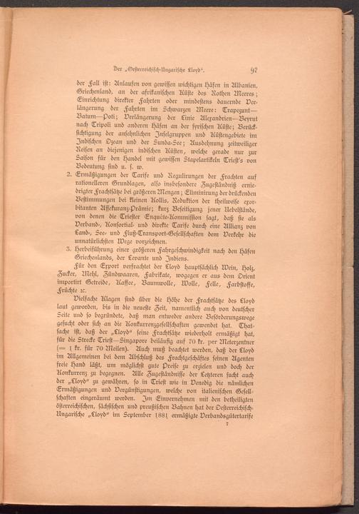 der Fall ist: Anlaufen von gewissen wichtigen Häfen in Albanien, Griechenland, an der afrikanischen Küste des Rochen Meeres; Einrichtung direkter Fahrten oder mindestens dauernde Verlängerung der Fahrten im schwarzen Meere: Trapezunt— Batum—j)oti; Verlängerung der Linie Alexandrien—Beyrut nach Tripoli und anderen Häfen an der syrischen Rüste; Berücksichtigung der ansehnlichen Inselgruppen und Küstengebiete im Indischen Ozean und der Sunda-See; Ausdehnung zeitweiliger Reisen an diejenigen indischen Rüsten, welche gerade nur zur Saison für den Handel mit gewissen Stapelartikeln Triest's von Bedeutung sind u. s. w.