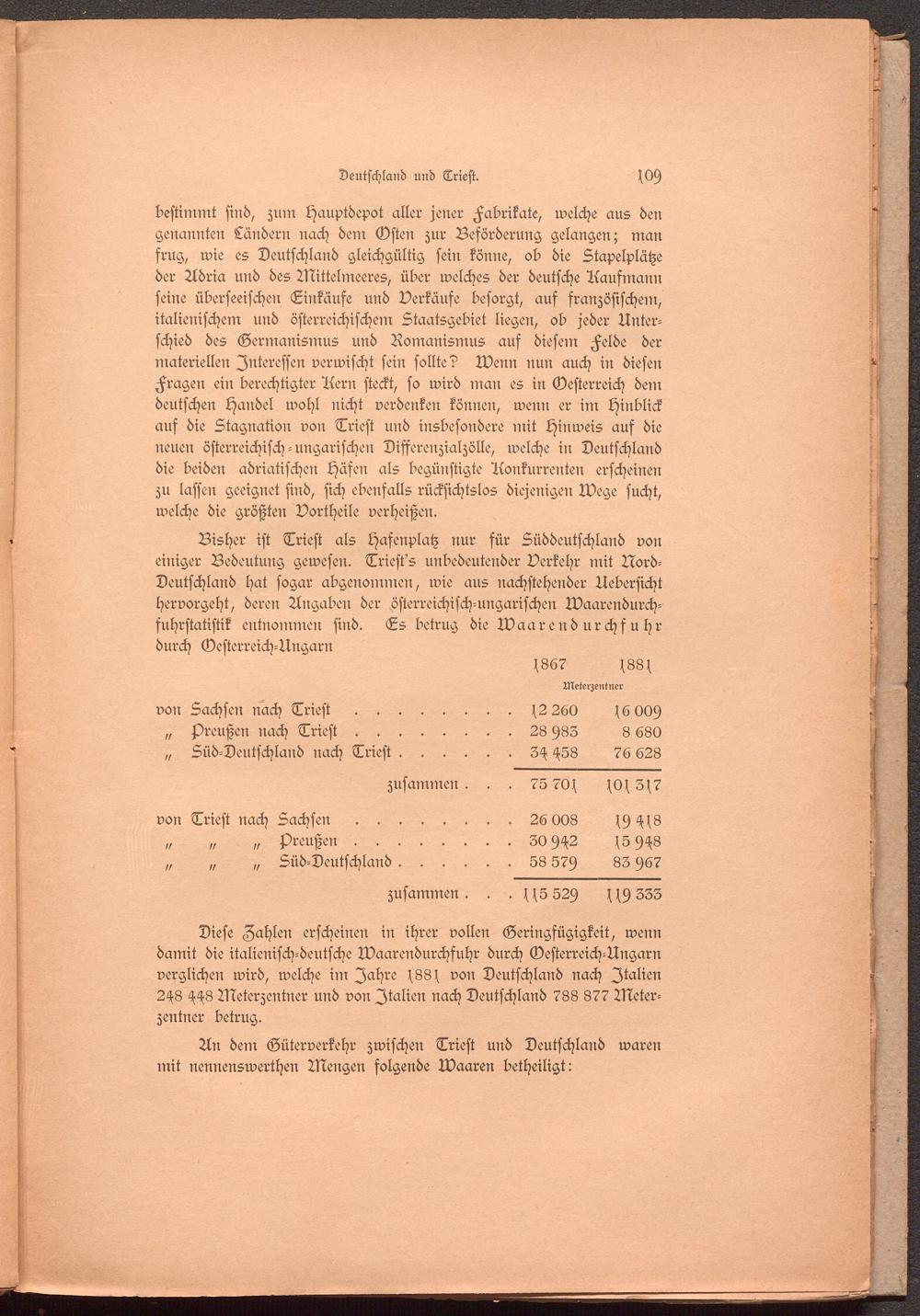 Bisher ist Triest als Hasenplatz nur für Süddeutschland von einiger Bedeutung gewesen. Triest's unbedeutender Verkehr mit Nord- Deutschland hat sogar abgenommen, wie aus nachstehender Uebersicht hervorgeht, deren Angaben der österreichisch-ungarischen Waarendurch- suhrstatistik entnommen sind. Es betrug die Warendurchfuhr durch Oesterreich-Ungarn