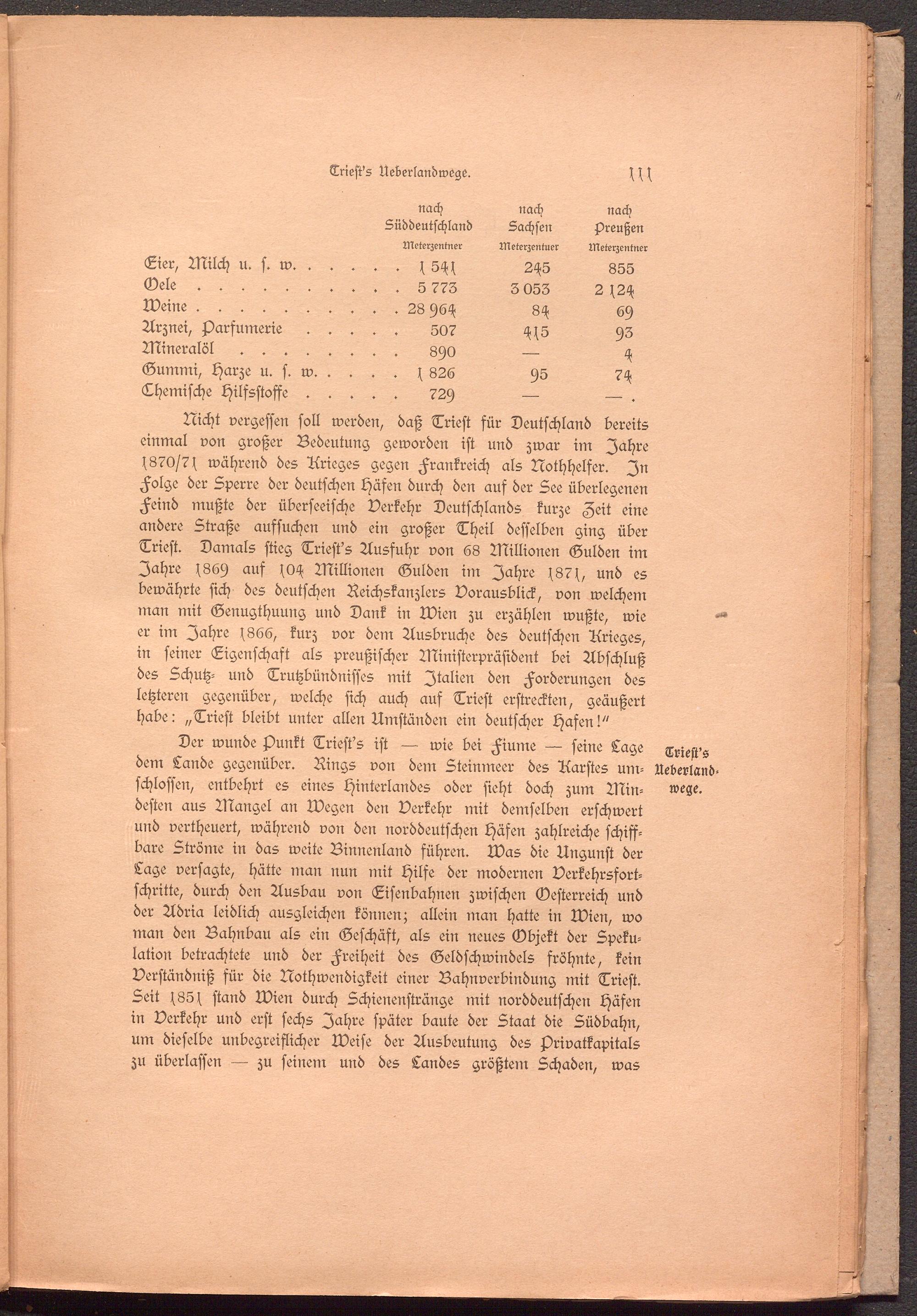 Nicht vergessen soll werden, daß Trieft sür Deutschland bereits einmal von großer Bedeutung geworden ist und zwar im Jahre l 870/7 l während des Arieges gegen Frankreich als Nothhelfer. In Folge der Sperre der deutschen Häfen durch den auf der Lee überlegenen Feind mußte der überseeische Verkehr Deutschlands kurze Zeit eine andere Straße aufsuchen und ein großer Theil desselben ging über Trieft. Damals stieg Triest's Ausfuhr von 68 Millionen Gulden im Jahre sch69 aus sOH Millionen Gulden im Jahre s87s, und es bewährte sich des deutschen Reichskanzlers Vorausblick, von welchem man mit Genugthuung und Dank in Wien zu erzählen wußte, wie er im Jahre s866, kurz vor dem Ausbruche des deutschen Arieges, in seiner Eigenschaft als preußischer Ministerpräsident bei Abschluß des Schutz- und Trutzbündnisses mit Italien den Forderungen des letzteren gegenüber, welche sich auch aus Trieft erstreckten, geäußert habe: „Trieft bleibt unter allen Umständen ein deutscher Hasen!"
