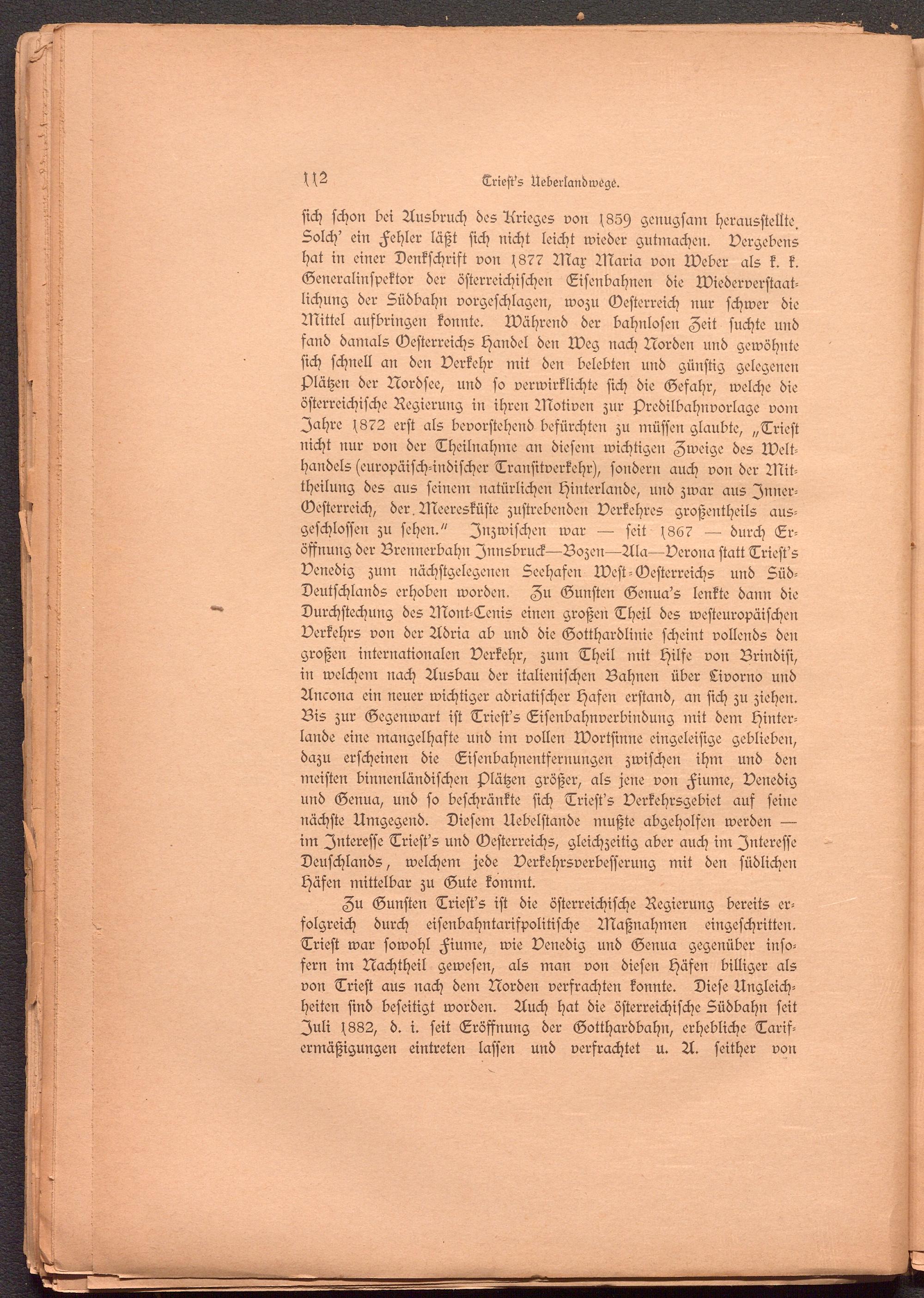 Zu Gunsten Triest's ist die österreichische Regierung bereits erfolgreich durch eisenbahntarispolitische Maßnahmen eingeschritten. Trieft war sowohl Fiume, wie Venedig und Genua gegenüber insofern im Nachtheil gewesen, als man von diesen Häfen billiger als von Trieft aus nach dem Norden verfrachten konnte. Diese Ungleichheiten sind beseitigt worden. Auch hat die österreichische Südbahn seit Juli s882, d. i. seit Eröffnung der Gotthardbahn, erhebliche Tarif- ermäßigungen eintreten lassen und verfrachtet u. A. seither von