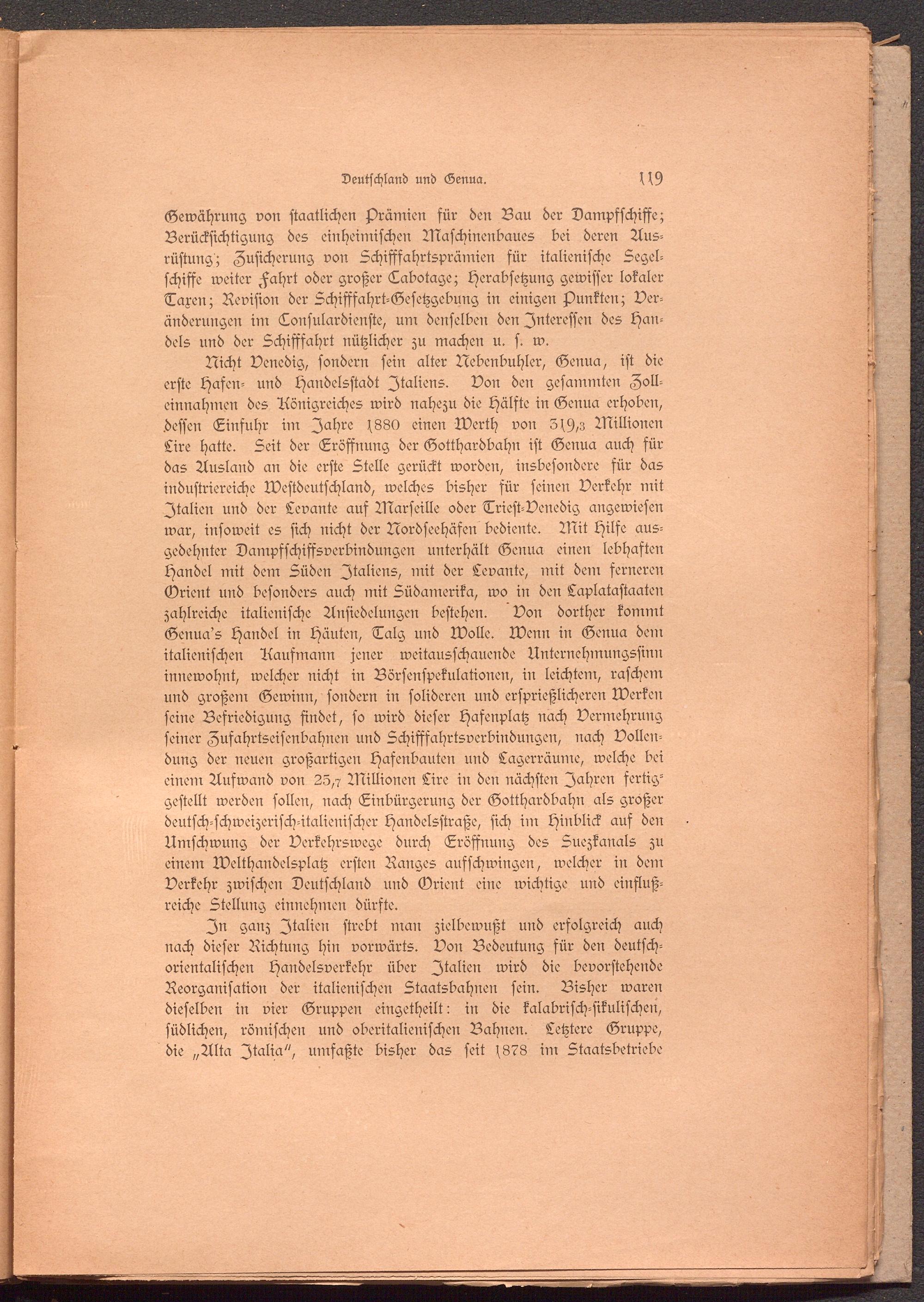 Nicht Venedig, sondern sein alter Nebenbuhler, Genua, ist die erste Hasen- und Handelsstadt Italiens. Von den gesammten Zolleinnahmen des Königreiches wird nahezu die Hälfte in Genua erhoben, .dessen Einfuhr im Jahre schsO einen Werth von 3 ich ,3 Millionen Lire hatte. Seit der Eröffnung der Gotthardbahn ist Genua auch für das Ausland an die erste Stelle gerückt worden, insbesondere für das industriereiche Westdeutschland, welches bisher für feinen Verkehr mit Italien und der Levante auf Marseille oder Trieft-Venedig angewiesen war, insoweit es sich nicht der Nordseehäfen bediente. Mit Hilfe ausgedehnter Dampfschiffsverbindungen unterhält Genua einen lebhaften Handel mit dem Süden Italiens, mit der Levante, mit dein ferneren Orient und besonders auch mit Südamerika, wo in den Laplatastaaten zahlreiche italienische Ansiedelungen bestehen. Von dorther kommt Genua's Handel in Häuten, Talg und Wolle. Wenn in Genua dem italienischen Kaufmann jener weitausschauende Unternehmungssinn innewohnt, welcher nicht in Börsenspekulationen, in leichtem, raschem und großem Gewinn, sondern in solideren und ersprießlicheren Werken seine Befriedigung findet, so wird dieser Hafenplatz nach Vermehrung seiner Zufahrtseisenbahnen und Schifffahrtsverbindungen, nach Vollendung der neuen großartigen Hafenbauten und Lagerräume, welche bei einem Aufwand von 25,7 Millionen Lire in den nächsten Jahren fertig' gestellt werden sollen, nach Einbürgerung der Gotthardbahn als großer deutsch-schweizerisch-italienischer Handelsstraße, sich im Hinblick auf den Umschwung der Verkehrswege durch Eröffnung des Suezkanals zu einem Welthandelsplatz ersten Ranges aufschwingen, welcher in den: Verkehr zwischen Deutschland und Orient eine wichtige und einflußreiche Stellung einnehmen dürfte.