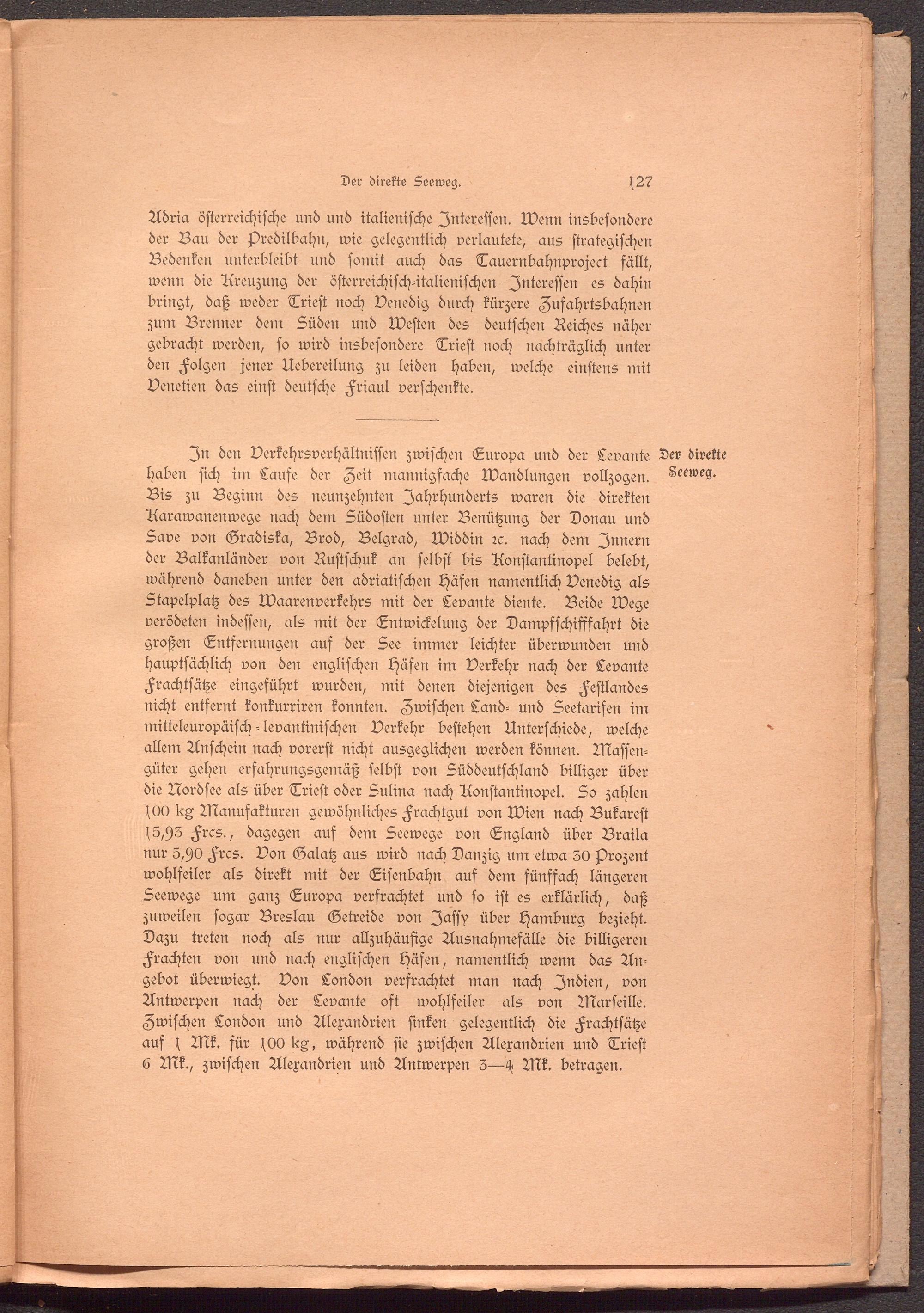 Dazu treten noch als nur allzuhäufige Ausnahmefälle die billigeren Frachten von und nach englischen Häfen, namentlich wenn das Angebot überwiegt. Von London verfrachtet man nach Indien, von Antwerpen nach der Levante oft wohlfeiler als von Marseille.