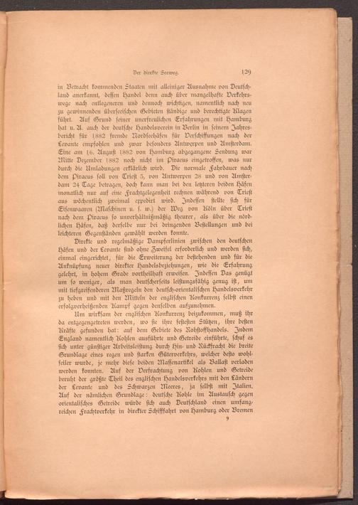 Direkte und regelmäßige Dampferlinien zwischen den deutschen Häfen und der Levante find ohne Zweifel erforderlich und werden sich, einmal eingerichtet, für die Erweiterung der bestehenden und für die Anknüpfung neuer direkter Handelsbeziehungen, wie die Erfahrung gelehrt, in hohem Grade vortheilhaft erweisen. Indessen Das genügt um so weniger, als man deutscherseits leistungsfähig genug ist, um mit tiefgreifenderen Maßregeln den deutsch-orientalischen Handelsverkehr zu heben und mit den Mitteln der englischen Konkurrenz selbst einen erfolgverheißenden Kampf gegen denselben aufzunehmen.