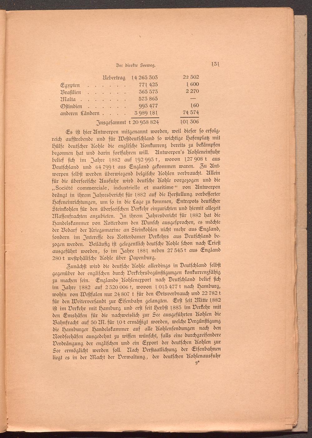 Zunächst wird die deutsche Aohle allerdings in Deutschland selbst gegenüber der englischen durch Verkehrsbegünstigungen konkurrenzfähig zu machen sein. Englands Aohlenexport nach Deutschland belief sich im Jahre f882 auf 2 320 006 t, wovon l 0f5 §77 t nach Hamburg, wohin von Westfalen nur 2§ 807 t für den Ortsverbrauch und 22 782 t für den Weiterversandt zur Eisenbahn gelangten. Erst seit Witte f882 ist im Verkehr mit Hamburg und erst seit Herbst f883 im Verkehr mit den Emshäfen für die nachweislich zur See ausgeführten Aohlen die Bahnfracht auf 50 W. für sO t ermäßigt worden, welche Vergünstigung die Hamburger Handelskammer auf alle Aohlensendungen nach den Nordseehäfen ausgedehnt zu wissen wünscht, falls eine durchgreifendere Verdrängung der englischen und ein Export der deutschen Aohlen zur See ermöglicht werden soll. Nach Verstaatlichung der Eisenbahnen liegt es in der Wacht der Verwaltung, der deutschen Aohlenausfuhr