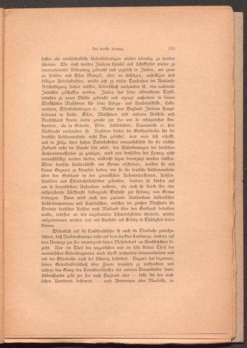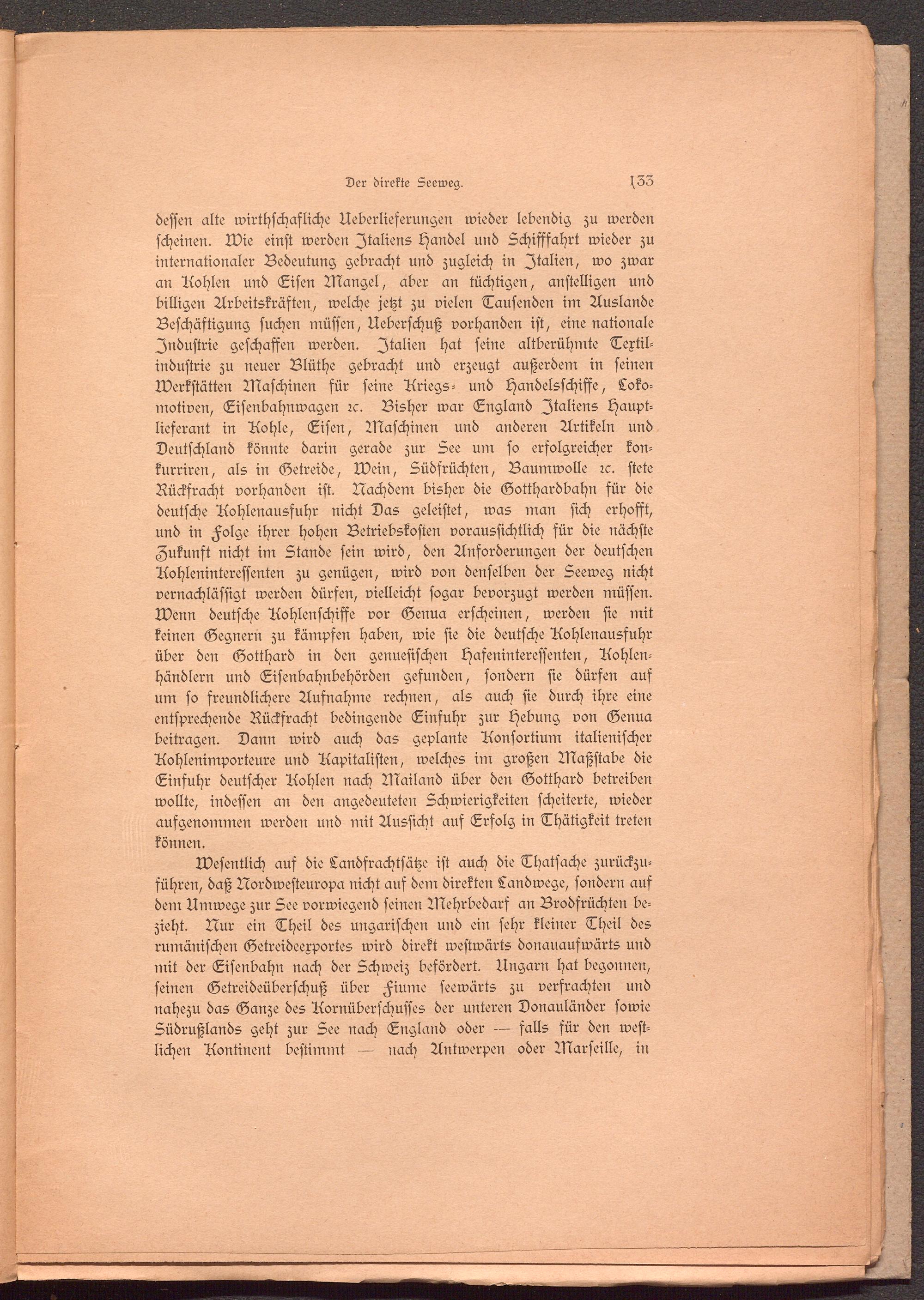 dessen alte wirthschafliche Ueberlieferungen wieder lebendig zu werden scheinen. N)ie einst werden Italiens Handel und Schifffahrt wieder zu internationaler Bedeutung gebracht und zugleich in Italien, wo zwar an Aohlen und Eisen Mangel, aber an tüchtigen, anstelligen und billigen Arbeitskräften, welche jetzt zu vielen Tausenden im Auslande Beschäftigung suchen müssen, Ueberschuß vorhanden ist, eine nationale Industrie geschaffen werden. Italien hat seine altberühmte Textilindustrie zu neuer Blüthe gebracht und erzeugt außerdem in seinen Werkstätten Maschinen für seine Ariegs- und Handelsschiffe, Lokomotiven, Eisenbahnwagen rc. Bisher war England Italiens Hauptlieferant in Aohle, Eisen, Maschinen und anderen Artikeln und Deutschland könnte darin gerade zur See um so erfolgreicher kon- kurriren, als in Getreide, Wein, Südfrüchten, Baumwolle rc. stete Rückfracht vorhanden ist. Nachdem bisher die Gotthardbahn für die deutsche Aohlenausfuhr nicht Das geleistet, was man sich erhofft, und in Folge ihrer hohen Betriebskosten voraussichtlich für die nächste Zukunft nicht im Stande fein wird, den Anforderungen der deutschen Aohleninteressenten zu genügen, wird von denselben der Seeweg nicht vernachlässigt werden dürfen, vielleicht sogar bevorzugt werden müssen. Wenn deutsche Aohlenschiffe vor Genua erscheinen, werden sie mit keinen Gegnern zu kämpfen haben, wie sie die deutsche Aohlenausfuhr über den Gotthard in den genuesischen Hafeninteressenten, Aohlen- händlern und Eisenbahnbehörden gefunden, sondern sie dürfen auf um so freundlichere Aufnahme rechnen, als auch sie durch ihre eine entsprechende Rückfracht bedingende Einfuhr zur Hebung von Genua beitragen. Dann wird auch das geplante Aonsortium italienischer Aohlenimporteure und Aapitalisten, welches im großen Maßstabe die Einfuhr deutscher Aohlen nach Mailand über den Gotthard betreiben wollte, indessen an den angedeuteten Schwierigkeiten scheiterte, wiederaufgenommen werden und mit Aussicht auf Erfolg in Thätigkeit treten können.