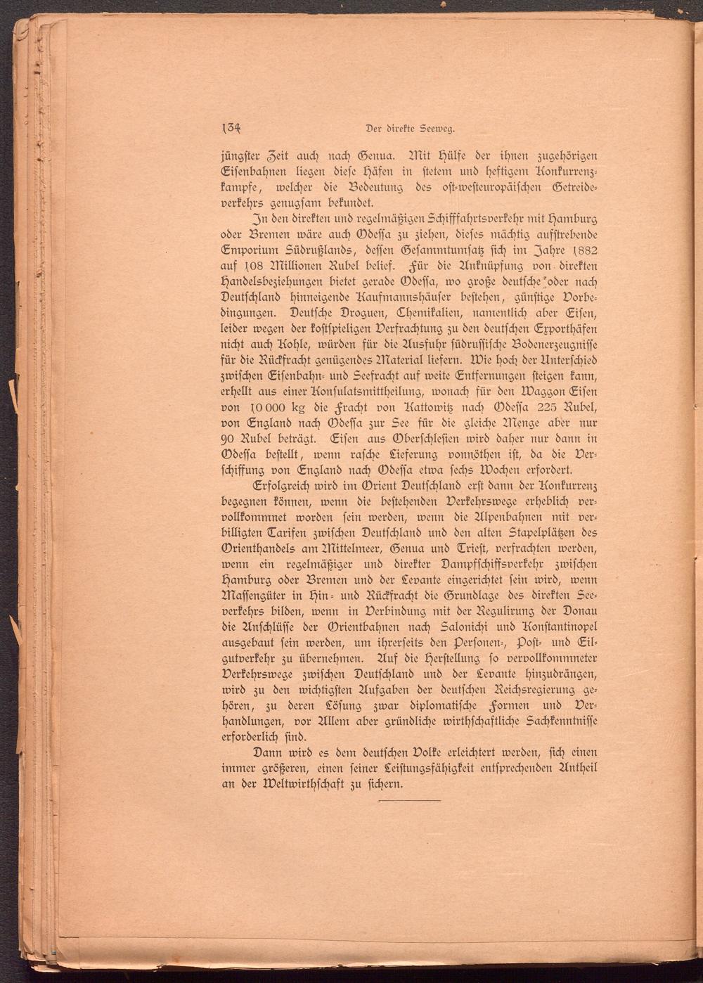 In den direkten und regelmäßigen Schifffahrtsverkehr mit Hamburg oder Bremen wäre auch Odessa zu ziehen, dieses mächtig aufstrebende Emporium Südrußlands, dessen Gesammtumsatz sich im Jahre f882 auf s08 Millionen Rubel belief. Für die Anknüpfung von direkten Handelsbeziehungen bietet gerade Odessa, wo große deutsche'oder nach Deutschland hinneigende Aausmannshäuser bestehen, günstige Vorbedingungen. Deutsche Droguen, Chemikalien, namentlich aber Eisen, leider wegen der kostspieligen Verfrachtung zu den deutschen Exporthäsen nicht auch Aohle, würden für die Ausfuhr südrussische Bodenerzeugnisse für die Rückfracht genügendes Material liefern. Wie hoch der Unterschied zwischen Eisenbahn- und Seefracht aus weite Entfernungen steigen kann, erhellt aus einer Aonsulatsmittheilung, wonach für den Waggon Eisen von O OOO die Fracht von Aattowitz nach Odessa 223 Rubel, von England nach Odessa zur See für die gleiche Menge aber nur 90 Rubel beträgt. Eisen aus Oberschlesien wird daher nur dann in Odessa bestellt, wenn rasche Lieferung vonnöthen ist, da die Verschiffung von England nach Odessa etwa sechs Wochen erfordert.