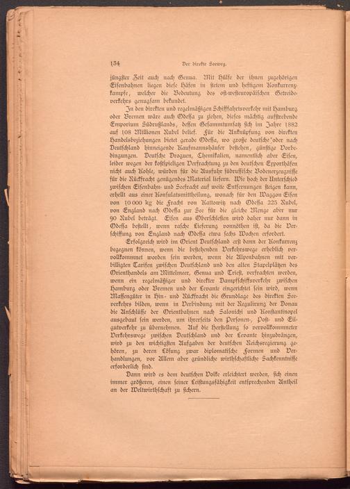 Erfolgreich wird im Orient Deutschland erst dann der Aonkurrenz begegnen können, wenn die bestehenden Verkehrswege erheblich vervollkommnet worden sein werden, wenn die Alpenbahnen mit verbilligten Tarifen zwischen Deutschland und den alten Stapelplätzen des Orienthandels am Mittelmeer, Genua und Trieft, verfrachten werden, wenn ein regelmäßiger und direkter Dampsschiffsverkehr zwischen Hamburg oder Bremen und der Levante eingerichtet sein wird, wenn Massengüter in Hin- und Rückfracht die Grundlage des direkten Seeverkehrs bilden, wenn in Verbindung mit der Regulirung der Donau die Anschlüsse der Orientbahnen nach Salonichi und Aonstantinopel ausgebaut sein werden, um ihrerseits den Personen-, j)ost- und Eilgutverkehr zu übernehmen. Aus die Herstellung so vervollkommneter Verkehrswege zwischen Deutschland und der Levante hinzudrängen, wird zu den wichtigsten Ausgaben der deutschen Reichsregierung gehören, zu deren Lösung zwar diplomatische Formen und Verhandlungen, vor Allem aber gründliche wirthschastliche Sachkenntnisse erforderlich sind.