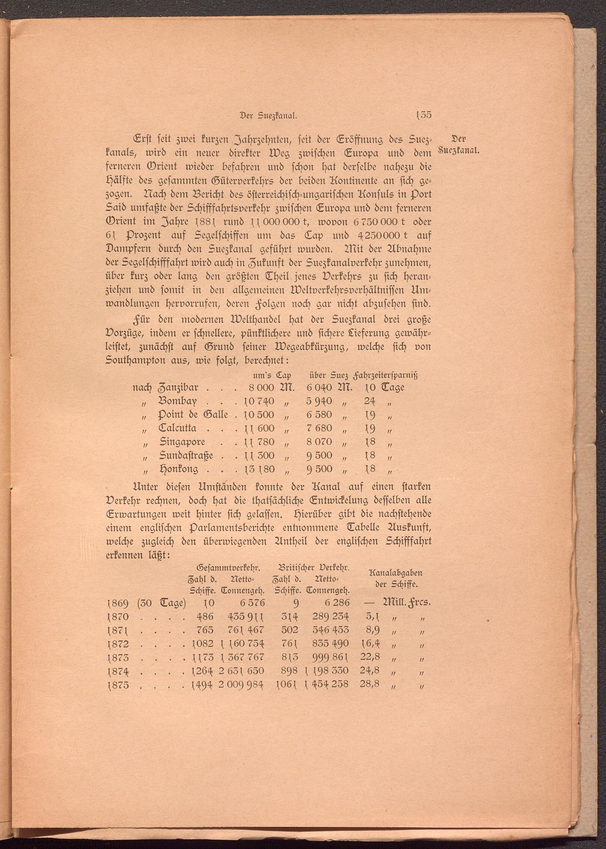 Für den modernen Welthandel hat der Suezkanal drei große Vorzüge, indem er schnellere, pünktlichere und sichere Lieferung gewährleistet, zunächst aus Grund seiner Wegeabkürzung, welche sich von
