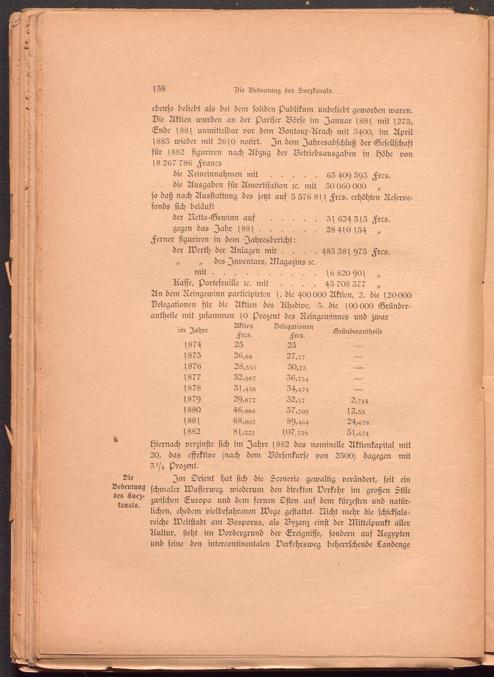 Hiernach verzinste sich im Jahre s882 das nominelle Aktienkapital mit 20, das effektive (nach dem Börsenkurse von 2500) dagegen mit 3^/4 Prozent.