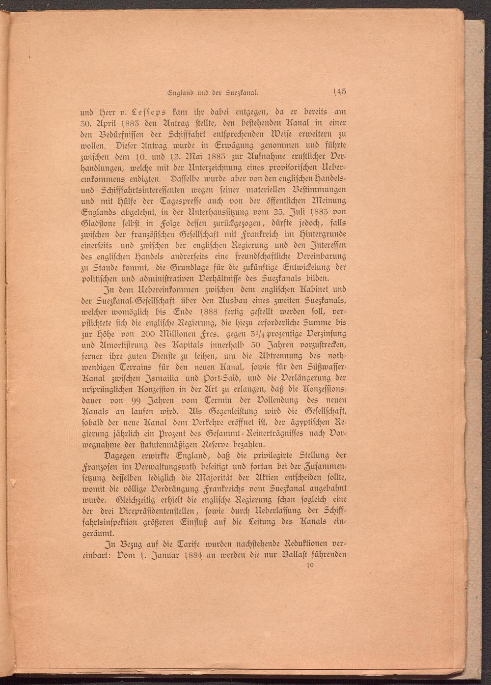 und Herr v. Lesseps kam ihr dabei entgegen, da er bereits am 30. April f883 den Antrag stellte, den bestehenden Aanal in einer den Bedürfnissen der Schifffahrt entsprechenden Weise erweitern zu wollen. Dieser Antrag wurde in Erwägung genommen und führte zwischen dem f0. und s2. Mai f885 zur Ausnahme ernstlicher Verhandlungen, welche mit der Unterzeichnung eines provisorischen Ueber- emkommens endigten. Dasselbe wurde aber von den englischen Handelsund Schifffahrtsinteressenten wegen seiner materiellen Bestimmungen und mit Hülfe der Tagespresse auch von der öffentlichen Meinung Englands abgelehnt, in der Unterhaussitzung vorn 25. Juli s885 von Gladstone selbst in Folge dessen zurückgezogen, dürste jedoch, falls zwischen der französischen Gesellschaft mit Frankreich im Hintergründe einerseits und zwischen der englischen Regierung und den Interessen des englischen Handels andrerseits eine freundschaftliche Vereinbarung zu Stande kommt, die Grundlage für die zukünftige Entwickelung der politischen und administrativen Verhältnisse des Suezkanals bilden.