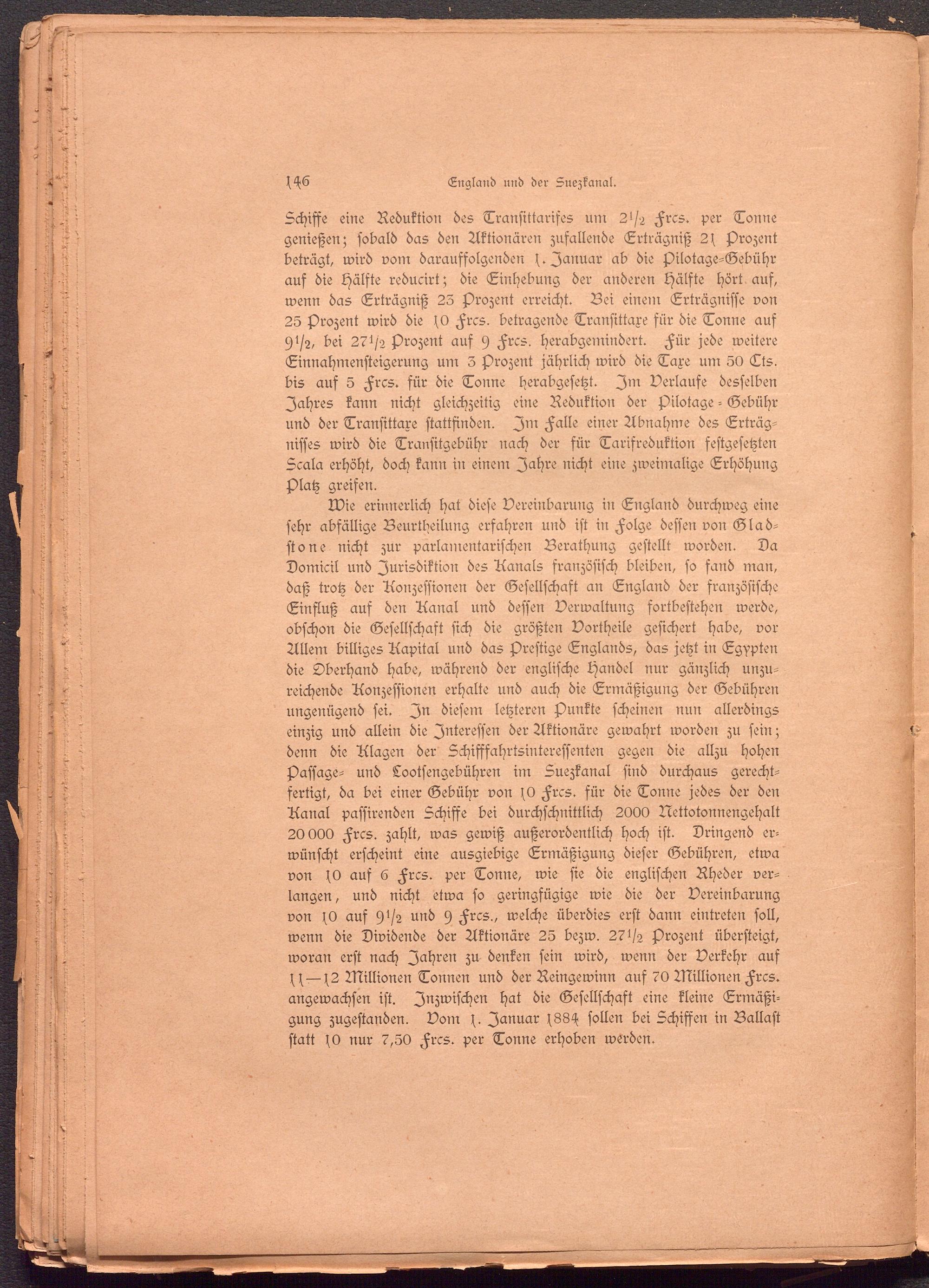 Schiffe eine Reduktion des Transittarifes um 21/2 Frcs. per Tonne genießen; sobald das den Aktionären zufallende Erträgniß 2f Prozent beträgt, wird vom darauffolgenden p Januar ab die Pilotage-Gebühr auf die Hälfte reducirt; die Einhebung der anderen Hälfte hört auf, wenn das Erträgniß 23 Prozent erreicht. Bei einem Erträgnisse von 25 Prozent wird die fO Frcs. betragende Transittaxe für die Tonne auf 91/2, bei 271/2 Prozent auf 9 Frcs. herabgemindert. Für jede weitere Einnahmensteigerung um 3 Prozent jährlich wird die Taxe um 50 Tts. bis auf 5 Frcs. für die Tonne herabgesetzt. Im Verlaufe desselben Jahres kann nicht gleichzeitig eine Reduktion der pilotage - Gebühr und der Transittaxe stattfinden. In: Falle einer Abnahme des Erträgnisses wird die Transitgebühr nach der für Tarifreduktion festgesetzten Scala erhöht, doch kann in einem Jahre nicht eine zweimalige Erhöhung Platz greifen.