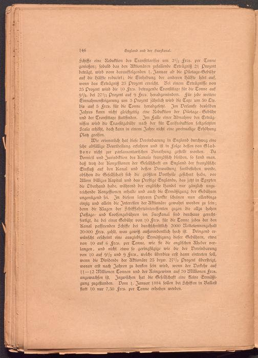 Wie erinnerlich hat diese Vereinbarung in England durchweg eine sehr abfällige Beurtheilung erfahren und ist in Folge dessen von Glad- stone nicht zur parlamentarischen Berathung gestellt worden. Da Domicil und Jurisdiktion des Aanals französisch bleiben, so fand man, daß trotz der Aonzessionen der Gesellschaft an England der französische Einfluß auf den Aanal und dessen Verwaltung fortbestehen werde, obschon die Gesellschaft sich die größten Vortheile gesichert habe, vor Allem billiges Aapital und das Prestige Englands, das jetzt in Egypten die Oberhand habe, während der englische Handel nur gänzlich unzureichende Aonzessionen erhalte und auch die Ermäßigung der Gebühren ungenügend sei. In diesem letzteren Punkte scheinen nun allerdings einzig und allein die Interessen der Aktionäre gewahrt worden zu sein; denn die Alagen der Schifffahrtsinteressenten gegen die allzu hohen Passage- und Lootsengebühren im Suezkanal sind durchaus gerechtfertigt, da bei einer Gebühr von IsO Frcs. für die Tonne jedes der den Aanal passirenden Schiffe bei durchschnittlich 2000 Nettotonnengehalt 20 000 Frcs. zahlt, was gewiß außerordentlich hoch ist. Dringend erwünscht erscheint eine ausgiebige Ermäßigung dieser Gebühren, etwa von fO auf 6 Frcs. per Tonne, wie sie die englischen Rheder verlangen, und nicht etwa so geringfügige wie die der Vereinbarung von fO auf 91/2 und 9 Frcs., welche überdies erst dann eintreten soll, wenn die Dividende der Aktionäre 25 bezw. 271/2 Prozent übersteigt, woran erst nach Jahren zu denken sein wird, wenn der Verkehr auf ^ —^2 Bkillionen Tonnen und der Reingewinn auf 70 Bkillionen Frcs. angewachsen ist. Inzwischen hat die Gesellschaft eine kleine Ermäßigung zugestanden. Vom Januar sollen bei Schiffen in Ballast statt fO nur 7,50 Frcs. per Tonne erhoben werden.