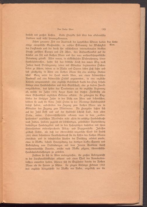 Schon geraunte Zeit vor Ausbruch der ägyptischen Wirren hatten Das Rothe einige europäische Großmächte, in rascher Erkennung der Wichtigkeit Meer. des Suezkanals und der durch ihn erschlossenen internationalen direkten Straße zwischen Europa und Ost-Asien, ihre Aufmerksamkeit auf die Länder am Nil und Rothen Meere und ihre neue weltverkehrspolitische Bedeutung gelenkt. Allen voran, in rücksichtsloser Wahrnehmung seiner Handelsinteressen, suchte sich das britische Reich den neuen Weg nach Indien durch Verlängerung seiner mit Gibraltar beginnenden Postenketten zu sichern, indem es in Malta und Typern festen Fuß faßte und fast gleichzeitig in Aden am Rothen Meere sich eine wichtige Station schuf. Ganz unter der Hand wurde Aden, um einen krämerischen Ausdruck aus eine krämerische Politik anzuwenden, in eine englische Rolonie umgewandelt: eine englische Gesellschaft kaufte den Alatz behufs Anlage einer Handelsstation und diese Gesellschaft, eine zu diesem Zwecke vorgeschobene, trat später das Territorium an die englische Regierung ab, welche im Jahre s839 kurzer Hand den bloßen Zivilbesitz als einen Bestandtheil englischen Gebietes erklärte. So gelangten die Engländer der fünfziger Jahre in den Besitz von Aden und beherrschen, seitdem sie auch die kleine Insel H>erim in der Meerenge Babelmandeb besetzt haben, unbestritten den Zugang zum Rothen Meere wie in Gibraltar den Zugang zum Mittelmeere. Die Franzosen ließen sich aus der Insel Dessi und aus der Halbinsel Scheich Said, dem alten Ocelis, nieder. Oesterreichischerseits erkannte man in dem „welten- spaltenden" arabischen Meerbusen nicht allein die wichtige Handelsstraße nach Indien, sondern zugleich ein selbständiges, gründlicher Ausforschung bedürftiges Handelsgebiet und in den Hasenplätzen desselben mit ihren Hinterländern vielversprechende Absatz- und Bezugsmärkte. Indessen geschah Nichts, als daß der österreichisch-ungarische Lloyd seit Herbst t88s einen besonderen Rundsahrtdienst für die Häfen des Rothen Meeres einrichtete und in industriellen Rreisen der Vorschlag erörtert wurde, etwa in Mokka, behufs Heranziehung des dortigen Aasfee-Exports und Anknüpfung von Verbindungen mit dem Innern Arabiens durch mohamedanische Bosnier, welche nach Mekka pilgern, österreichische Handelsniederlassungen zu gründen.