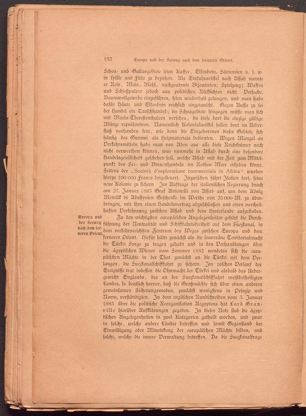 Schoa- und Gallasgebiete seien Aaffee, Elfenbein, Sämereien u. s. w. in Hülle und Fülle zu beziehen. Als Einfuhrartikel nach Afsab nannte er Reis, Mais, Mehl, nachgeahmte Bijouterien, Spielzeug; Waffen und Schießpulver jedoch aus politischen Rücksichten nicht. Versuche, Baumwollgewebe einzuführen, seien wiederholt gelungen, und man habe dafür Häute und Elfenbein reichlich eingetauscht. Gegen Aussa zu sei der Handel ein Tauschhandel; im Schoagebiete hingegen müsse man sich mit Maria-Theresienthalern versehen, da diese dort die einzige gültige Münze repräsentiren. Namentlich Aolonialartikel sollen dort im Aeber- fluß vorhanden sein, wie denn die Eingeborenen dieser Gebiete sich häufig des Gummi als Heizmaterials bedienten. Wegen Mangel an Verkehrsmitteln habe man von Aden aus alle diese Reichthümer noch nicht verwerthen können, was nunmehr in Assab durch eine besondere Handelsgesellschaft geschehen soll, welche Assab mit der Zeit zum Mittelpunkt des See- und Binnenhandels im Rothen Meer erheben könne. Seitens der „Locietu ä'esploratione commerciale in ^.frica" wurden hierzu sOO OOO Francs beigesteuert. Inzwischen fährt Italien fort, seine neue Aolonie zu sichern Im Auftrage der italienischen Regierung brach am 27. Januar ;885 Graf Antonelli von Assab auf, um dem Aönig Menelik in Abessyuien Geschenke im Werthe von 25 000 M. zu überbringen, mit ihm einen Handelsvertrag abzuschließen und einen vortheil- haften Verkehrsweg zwischen Assab und dein Hinterlands aufzufinden. Europa und Zu den wichtigsten europäischen Angelegenheiten gehört die Durch- der Zeervcg sühimng der Neutralität und Schifffahrtsfreiheit auf dem Süezkanal, in neren Grünt verkehrsreichsten Zentrum des Weges zwischen Europa und dem 'ferneren Orient. Hiefür hätte zunächst als die souveräne Territorialmacht die Türkei Sorge zu tragen gehabt und in den Verhandlungen über die ägyptischen Wirren vorn Sommer f882 wendeten sich die europäischen Mächte in der That zunächst an die Türkei mit dem Verlangen, die Suezkanalschifffahrt zu sichern. Im raschen Verlauf der Ereignisse trat indessen die Ohnmacht der Türkei und alsbald das Ueber- gewicht Englands, des an der Suezkanalschifffahrt meistbetheiligten Landes, so deutlich hervor, daß die Großmächte sich über einen anderen gemeinsamen Sicherungsmodus, zunächst wenigstens in Prinzip und Norm, verständigten. In dem englischen Rundschreiben vorn 5. Januar s885 über die politische Reorganisation Aegyptens hat Lord Gran- ville hierüber Aufklärungen gegeben. In dieser Note sind die ägyptischen Angelegenheiten in zwei Aategorien getheilt worden, und zwar in solche, welche andere Länder betreffen und somit Gegenstand der Einwilligung oder Mitwirkung der europäischen Mächte bilden, und solche, welche die innere Verwaltung betreffen. Da die Suezkanalfrage